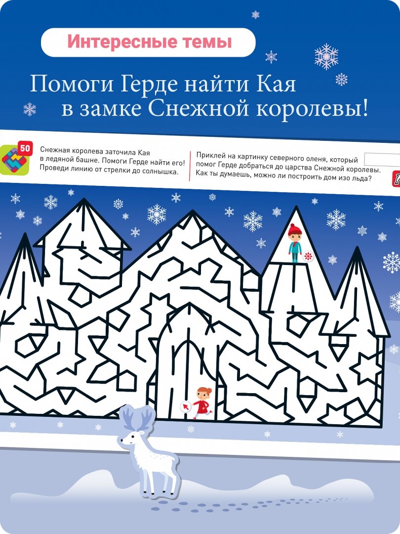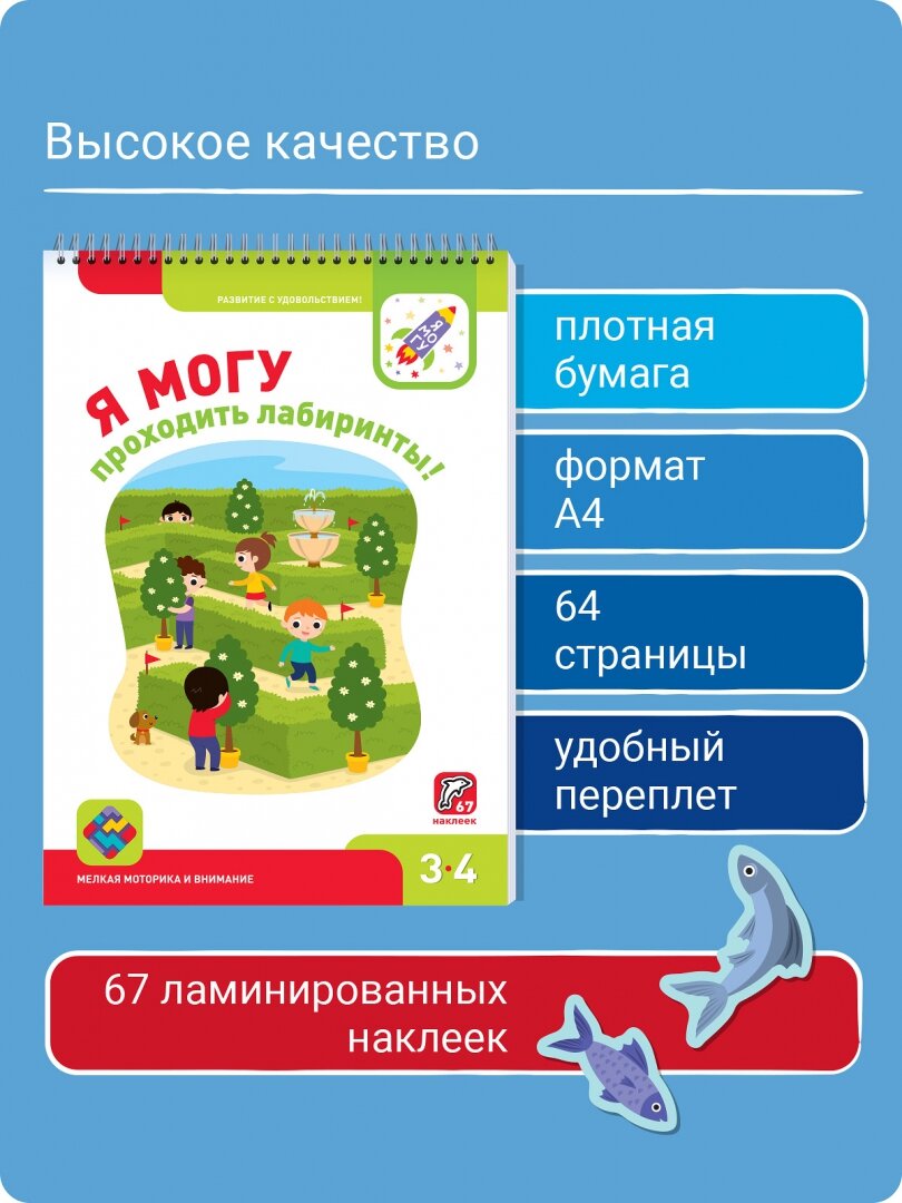 Продолжение лабиринтов на возраст 3-4 года. Советую начинать с книжки на 2-3 года, так ребеночек плавно перейдет от самого простого к более сложным. Авторы данного пособия совместили прохождение лабиринтов (как у кумон) и логические задачи. на одной стороне листа - просто лабиринт, на другой логический лабиринт. Обидно, что по мере увели чения сложности уменьшается количество наклеек. для детей 2-3 года, наклейки были, примерно через страницу. Ждесь, наверное на пятую часть заданий, как бы ни меньше. в целом, изданием довольна. После прохождения этих лабиринтов, можно будет браться за сюжетные, так скажем со смыслом.