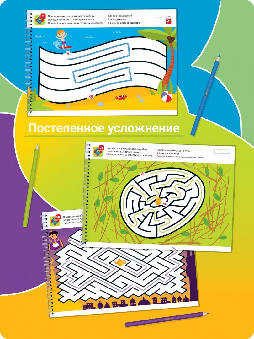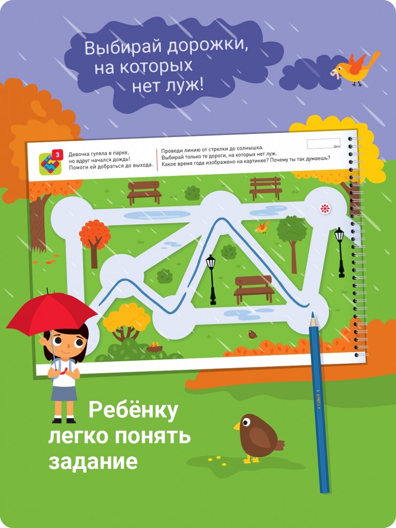 Чудесный альбом, дочка не хочет выпускать из рук. Не понимаю почему ещё не все развивающие журналы делают на пружинке? Это очень удобно. Ребёнок за раз сделал половину тетради. Понравилось что задания не просто пройти из точка А в точку Б, а есть история контекст, у дочки сразу появился азарт помогать и спасать. Очень рекомендую использовать прозрачную папку и стираемый маркер, чтобы задания можно было выполнять не один раз. Ещё понравилось что задания усложняются.