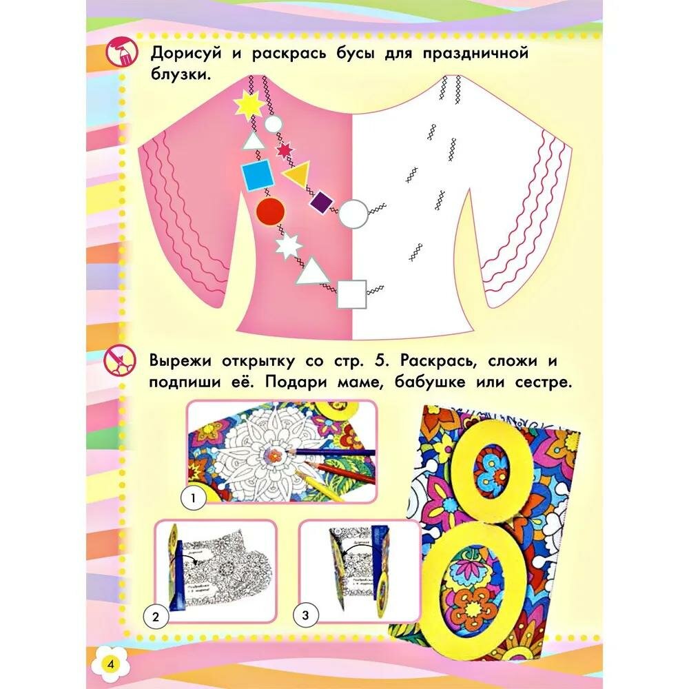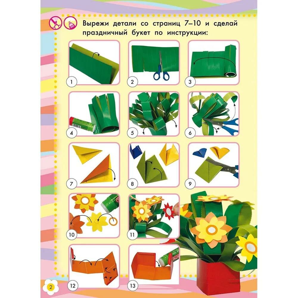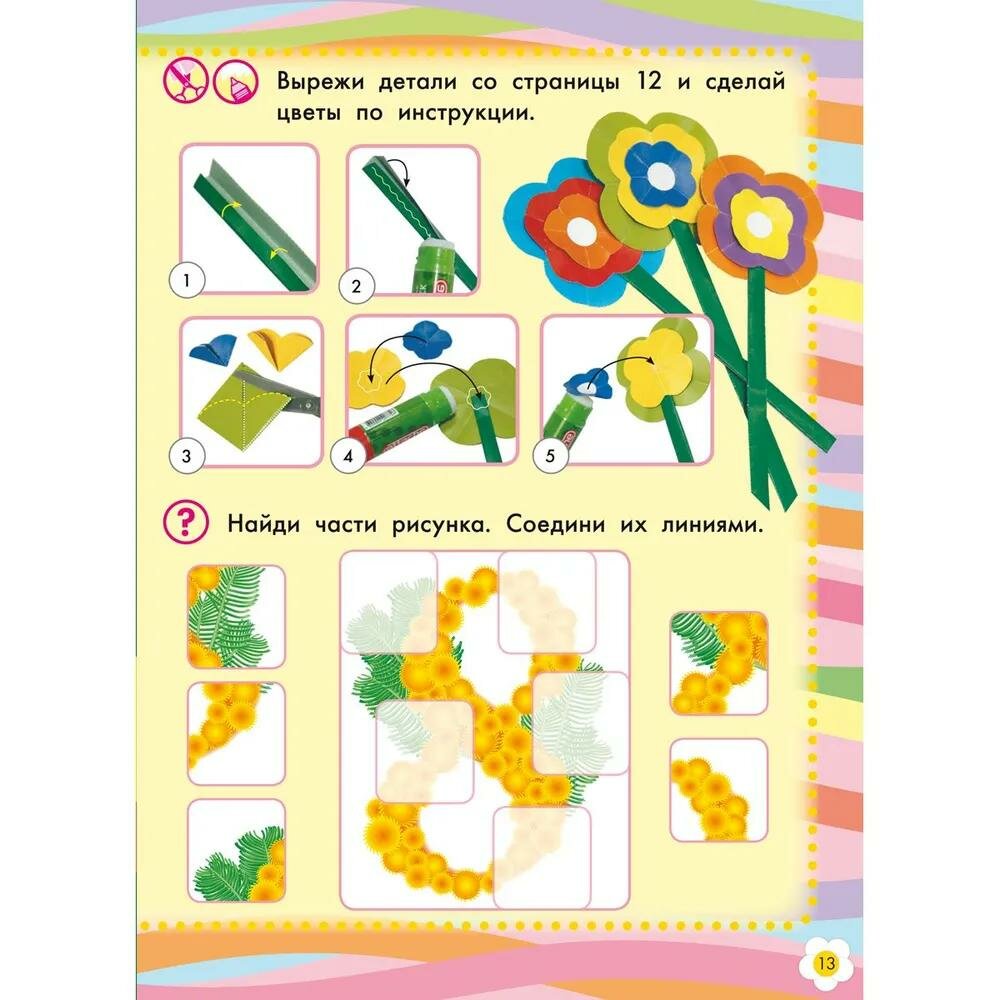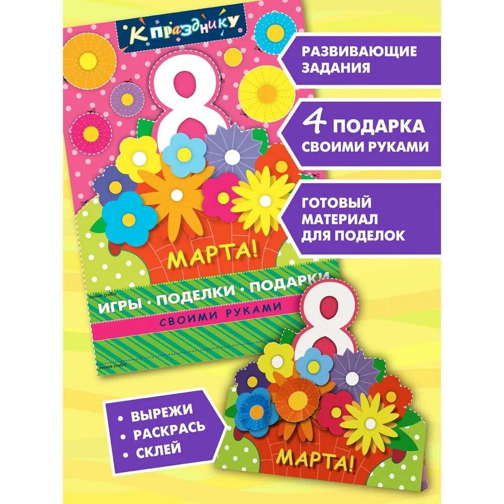 Книга "8 Марта" из серии "К празднику" станет отличным подарком для вашего ребенка. В ней содержатся увлекательные задания, а также аппликации и поделки. С ее помощью ребенок сможет своими руками сделать подарки к 8 Марта для мамы, бабушки, сестры или подруги. Ребенку потребуются ножницы, клей, цветные карандаши или фломастеры. Если будет нужно, помогите ребенку аккуратно вырезать мелкие детали, проделать отверстия и склеить поделки. Центральные страницы с заготовками для поделок можно заранее вынуть из книги.