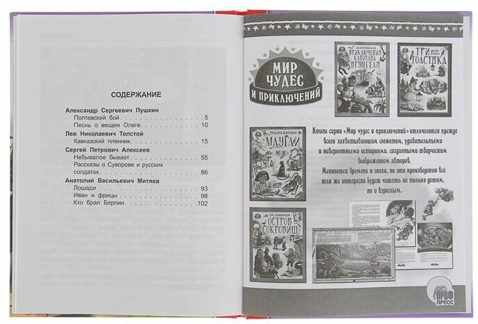 В описание к книге не указано содержание, поэтому думаю кому-то будет точно полезно. Сюда вошли произведения А.С. Пушкина «Полтавский бой», «Песнь о вещем Олеге»; Л.Н.Толстого «Кавказский пленник»; С.П.Алексеева «Небывалое не бывает», «Рассказы о Суворове и русских солдатах»; Митяева «Лошади», «Иван и фрицы», «Кто брал Берлин». Отличная серия в переплёте, с крупный шрифтом, белыми страницами. Есть даже небольшое количество черно-белых иллюстраций.