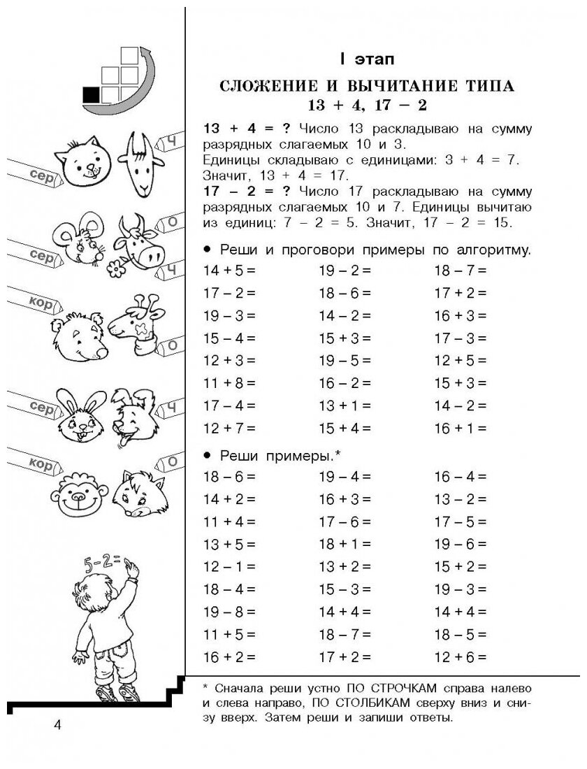 Это брошюрка, размером с тетрадку, черно-белая печать, но на самом деле это не главное. Главное тут то, что перед каждыми тестами расписано логическое пояснение понятное первоклашке. Книга разбита на три этапа изучения. Так же понравилось составление, есть система мотивации, как и у нас в школе, за правильно решенные примеры можно ставить смайлики и так же есть временные пределы к которым нужно стремиться, например решить указанное количество примеров за 40сек. В общем из всех закупленных стопкой тренажеров, этот единственный который ребенок сам с удовольствием решает.