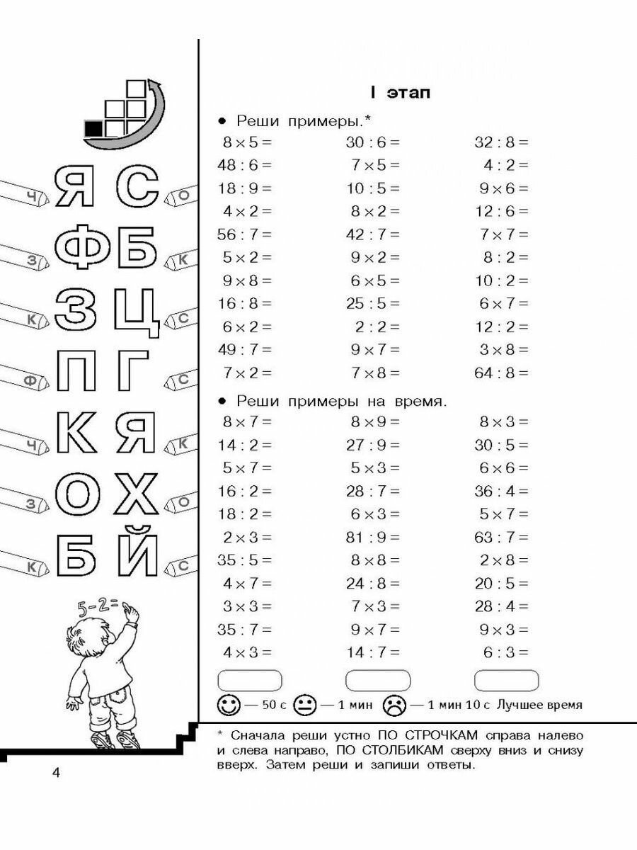 Это учебное пособие мне очень понравилось и помогло внуку научиться быстро выполнять умножение и деление.Он по своей природе медлительный, но у него появился интерес считать на время и у него получается решать 33 примера за время менее 50 секунд.Отлично, что не нужно придумывать примеры, писать их каждый день в тетради, их очень-очень много. Действительно, эта книга нам очень помогает в учебе! Внук занимается по ней ежедневно и это дает положительный результат! Рекомендую это пособие, не пожалеете!