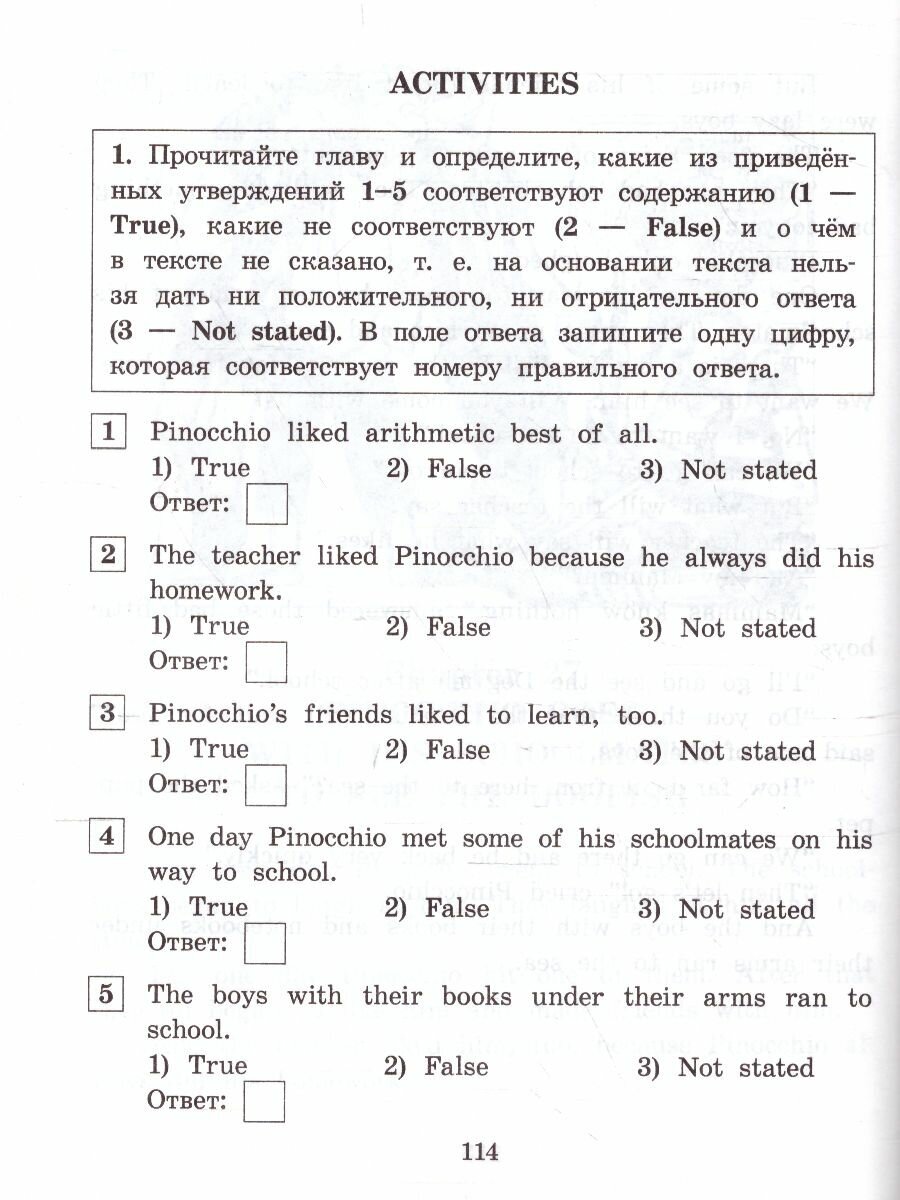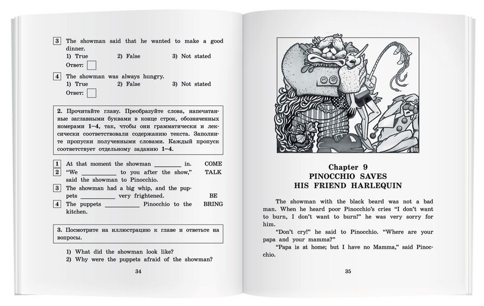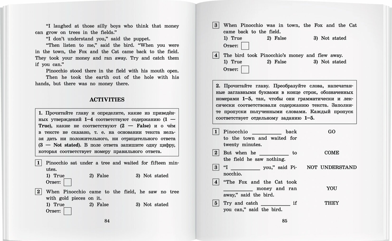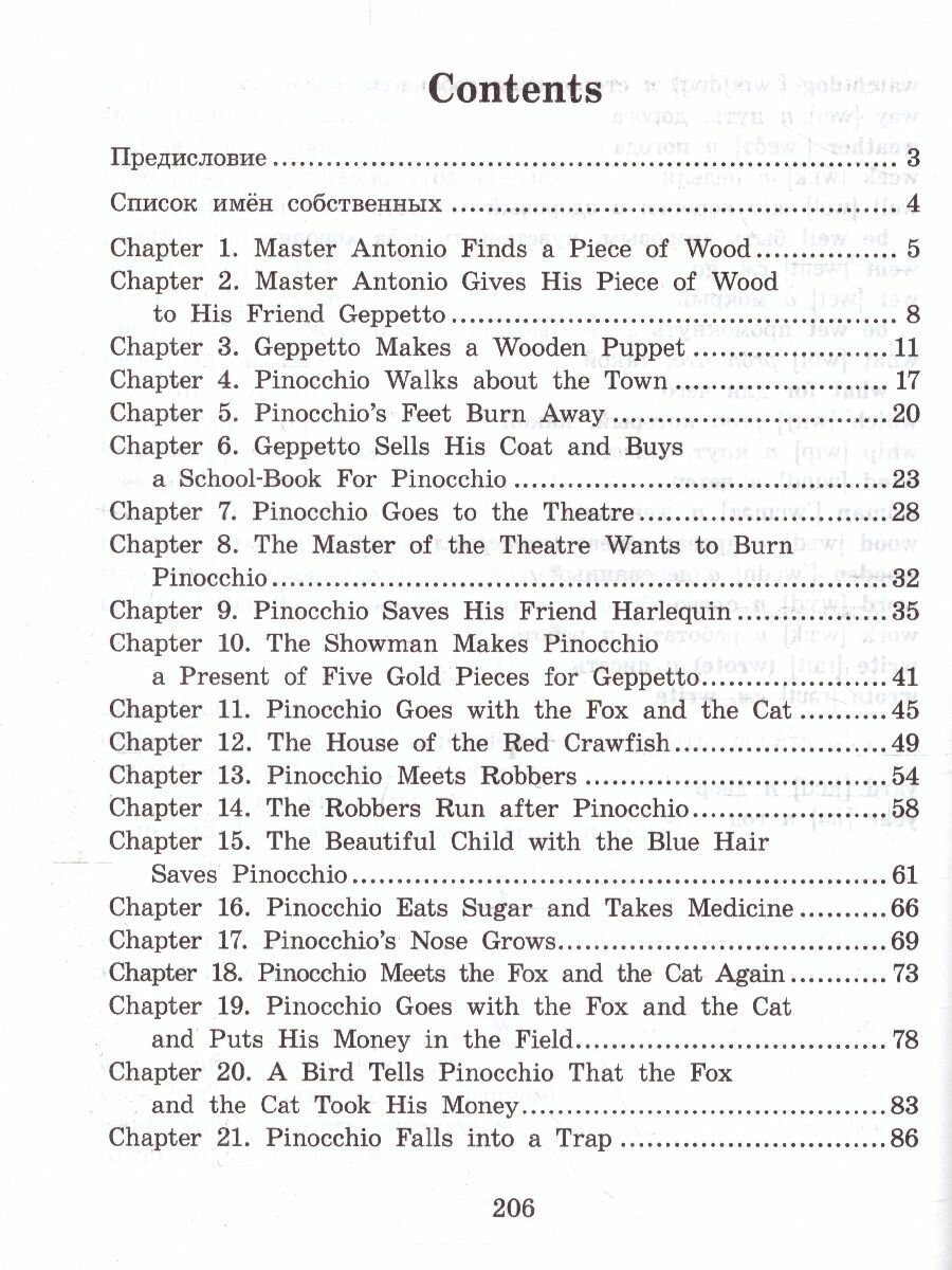 Книга представляет собой адаптацию знаменитой сказки итальянского писателя Карло Коллоди (1826 — 1890) "Приключения Пиноккио". Чтение этой великолепной книги о необыкновенных приключениях деревянного мальчика неизменно приносит радость детям и взрослым. Данное пособие поможет учащимся средней школы подготовиться к основному государственному экзамену по английскому языку. Текст пособия адаптирован в учебных целях до уровня Elementary. Каждая глава сопровождается упражнениями, направленными на формирование коммуникативной компетенции учащихся. Упражнения позволят сформировать коммуникативные умения в чтении, письменной речи и говорении, а также развить лексико-грамматические навыки. В конце пособия помещён словарь, а также тест в формате ОГЭ с ключами. Книга предназначена учащимся 5 - 8 классов образовательных организаций, а также широкому кругу лиц, изучающих английский язык.