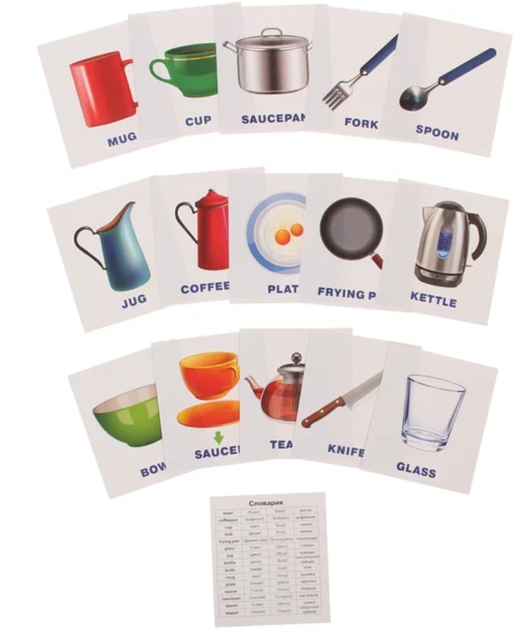 Набор «Посуда» знакомит ребенка со словами, обозначающими посуду, столовые приборы и кухонную технику, способствует расширению словарного запаса. В набор входят 15 карточек с цветными картинками, карточка «Словарик» и инструкция для родителей. Предназначен для детей дошкольного возраста.