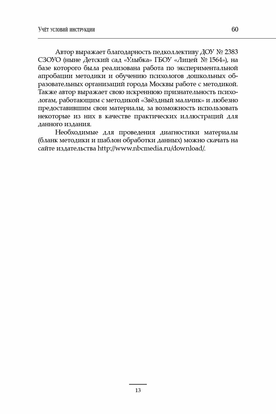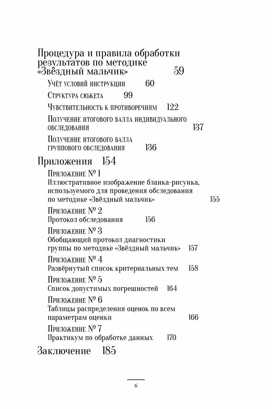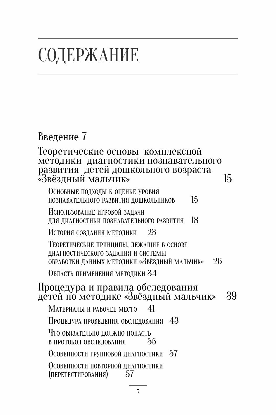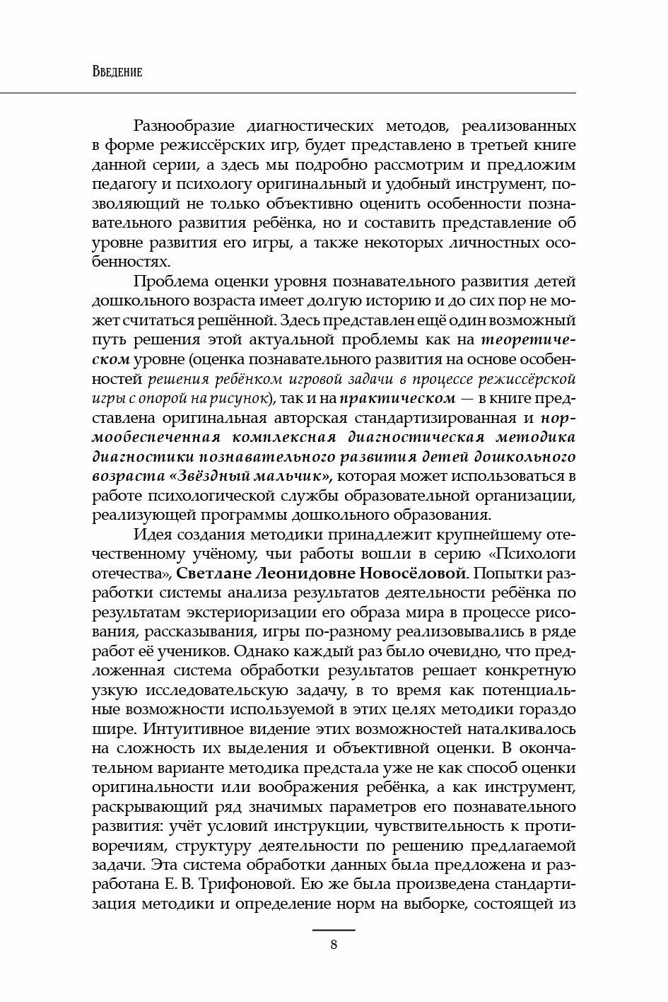 В книге представлена практико-ориентированная нормообеспеченная комплексная методика диагностики познавательного развития детей дошкольного возраста «Звёздный мальчик» (идея С. Л. Новосёловой, разработка Е. В. Трифоновой). Методика основывается на анализе деятельности ребёнка в процессе режиссерской игры с опорой на рисунок.
