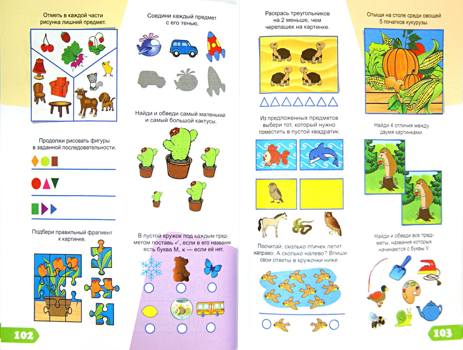 Книга очень понравилась. Заданий очень много - по 6 заданий на одной страничке, так что хватит надолго. Единственное "но" - не каждый ребенок в возрасте 3-4 сможет решить все задания, потому как задания есть и на сложение и на вычитание и много заданий с буквами и даже слогами. Но думаю, это не так критично, просто надо смотреть по своему ребенку и предлагать задания в зависимости от усвоения материала. Очень много логических заданий, рисования по точкам, рисование узоров по образцу, поиск правильного фрагмента, поиск правильной тени предметов, затрагиваются понятия больше-меньше, понятие форм. В общем задания на любой вкус и цвет. Бумага плотная, рисунки приятные, четкие.