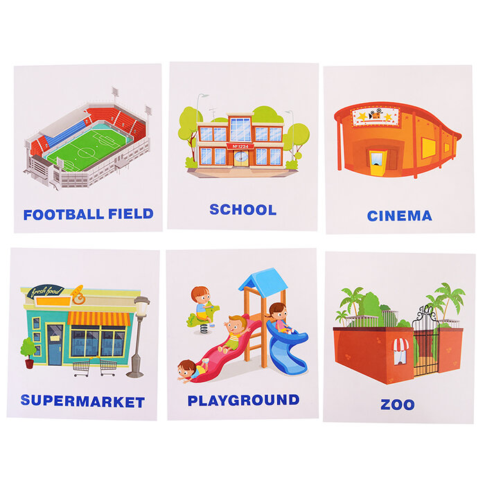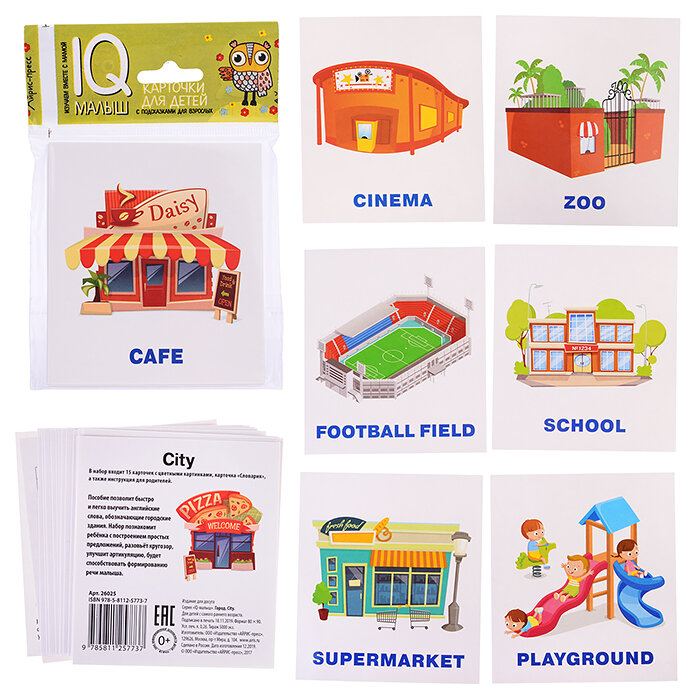 15 карточек по теме город, включают в себя различные места (здания в городе), начиная от кафе и ресторана, заканчивая полицейским участком и футбольным полем. карточки охватывают почти все нужные слова по теме, даже те, которые нужны детям на более поздних ступенях обучения (не в начальной школе). качество карточек не вызывает нареканий. не похоже, что сотрутся после того, как их пару раз потрогают.