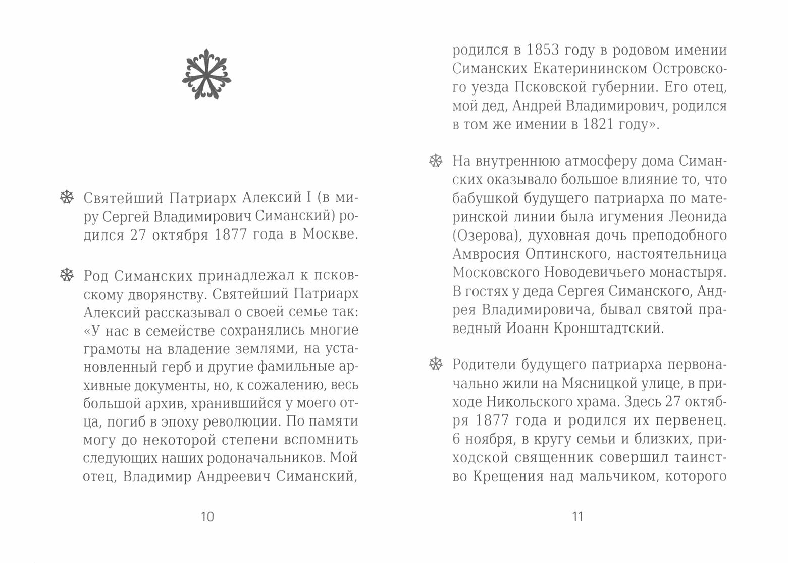 Книга посвящена Алексию I (Симанскому; 1877–1970), Святейшему Патриарху Московскому и всея Руси. Он прожил долгую и трудную жизнь. Был предстоятелем нашей Церкви в течение 25 лет (1945–1970). На его долю выпало возрождать Русскую Православную Церковь в послевоенные годы. Мудрая позиция Патриарха Алексия I, его исключительно высокий в глазах всего общества авторитет сыграли важнейшую роль в деле сохранения и последующего возрождения церковной жизни в России.