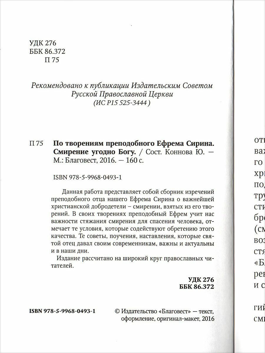 Работа "Смирение угодно Богу. По творениям преподобного Ефрема Сирина" представляет собой сборник изречений преподобного Ефрема Сирина о важнейшей христианской добродетели - смирении, взятых из его творений. В своих трудах святой отец учит нас важности стяжания смирения для спасения человека, отмечает те условия, которые содействуют обретению этого качества. Те советы, поучения, наставления, которые преподобный давал своим современникам, важны и актуальны и в наши дни.