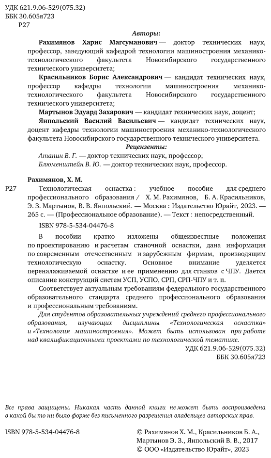 Технологическая оснастка. Учебное пособие для СПО (Красильников Борис Александрович; Рахимянов Харис Магсуманович; Мартынов Эдуард Захарович; Янпольский Василий Васильевич); ЮРАЙТ, 2019