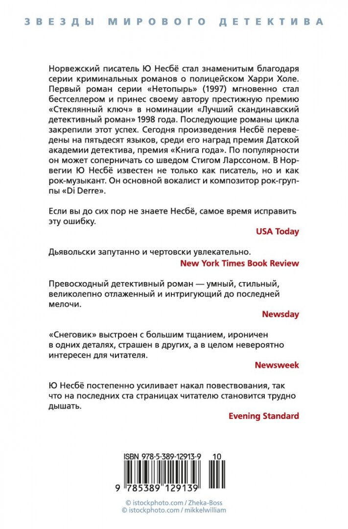 Самая лучшая книга Несбё, который, к слову, не только писатель, но и рок музыкант! Это и по его книгам чувствуется. На самом деле моя любовь к скандинавской литературе началась именно с нее. Перечитала все книги этого автора и с нетерпением жду новых его шедевров. Мороз по коже от его триллеров. С нетерпением жду экранизации этого произведения! Все-таки именно скандинавы сейчас пишут лучшие детективы. А Несбё пишет лучше всех остальных, включая Манкеля и Стига Ларссона. Не понравилась только одна его книга - "Охотники за головами'. Экранизация, кстати, тоже так себе. Так что тем, кто еще не читал, советую окунуться в мир саспенса с Несбё и его героями!