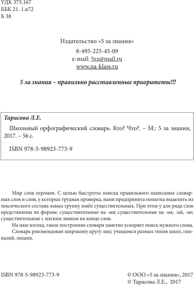 Школьный орфографический словарь. Кто? Что? (Любовь Евгеньевна Тарасова); 5 за знания, 2017