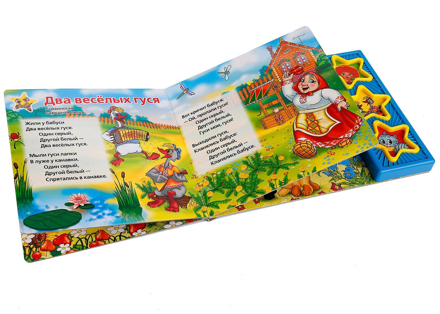 В этой яркой музыкальной книге представлены тексты песенок из трех известных мультфильмов: "Антошка", "Два веселых гуся" и "Мы делили апельсин". Иллюстрации напоминают кадры из мультика. С правой стороны расположены 3 звуковые кнопки в виде больших звездочек с изображением знакомых героев. Нажимая на эти кнопки, малыш услышит фрагменты веселых песенок. Все страницы книги выполнены из плотного картона, их трудно помять или порвать, поэтому книга подойдет даже самым маленьким.