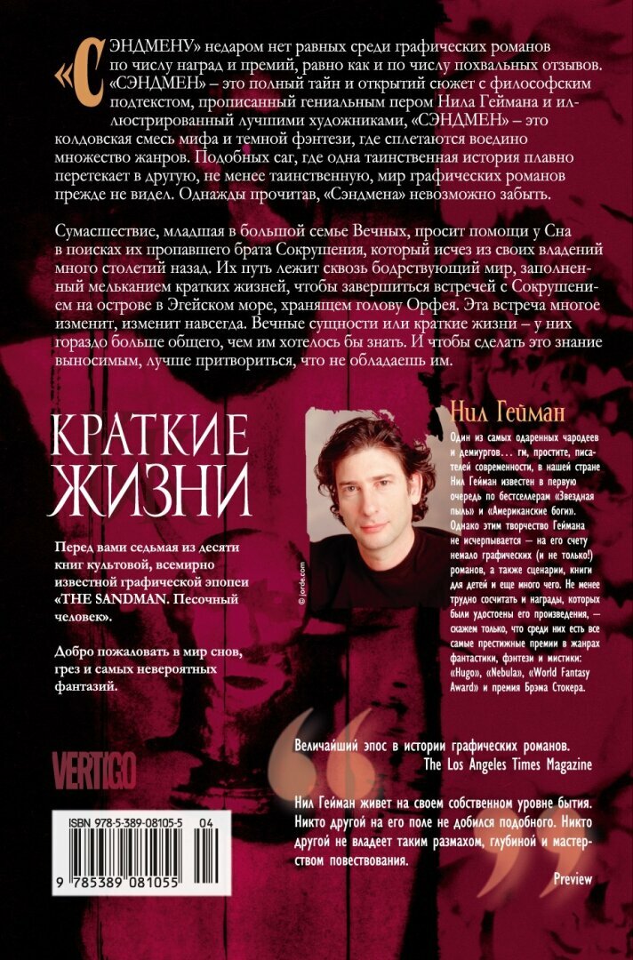 Отличное продолжение серии от невероятного Нила Германа, в данном произведение все очень 18плюс но по делу. Рассказ здесь более идёт не о Морфее, а о другом Вечном, точнее Вечной - Счастье. Которая в наши времена превратилось в нечто другое, как и их брат, который давно ушёл из вечных. Как всегда есть о чем поразмыслить, стилистика тут все такая же, читалось на одном дыхании, буквально за вечер, очень понравилось планирую поизучать ещё раз более детально. Супер обложка как всегда на высшем уровне, хотя в принципе без неё книги смотрятся очень приятно, и не только украсят вашу библиотеку, но и скрасят Ваш вечер. Однозначно рекомендую и с нетерпением жду продолжения!!!