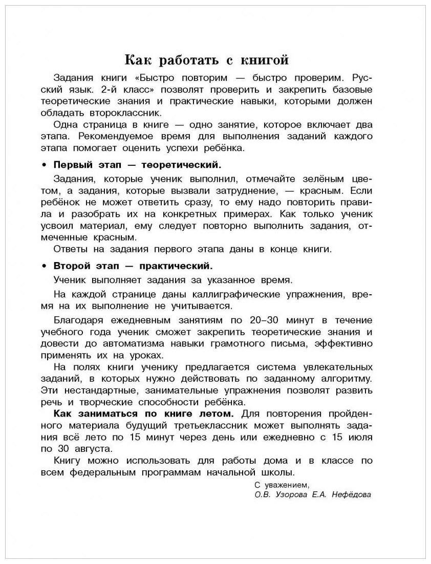 Учебное пособие известных педагогов-практиков О.В. Узоровой и Е.А. Нефёдовой "Быстро повторим - быстро проверим. Русский язык. 2-й класс" поможет школьнику проверить и закрепить знания и умения по курсу русского языка 2-го класса. Нестандартные и занимательные упражнения на полях книги позволят развить речь, мышление, внимание, память и творческие способности ребёнка. Пособие можно использовать для работы дома и в классе по всем федеральным программам начальной школы.