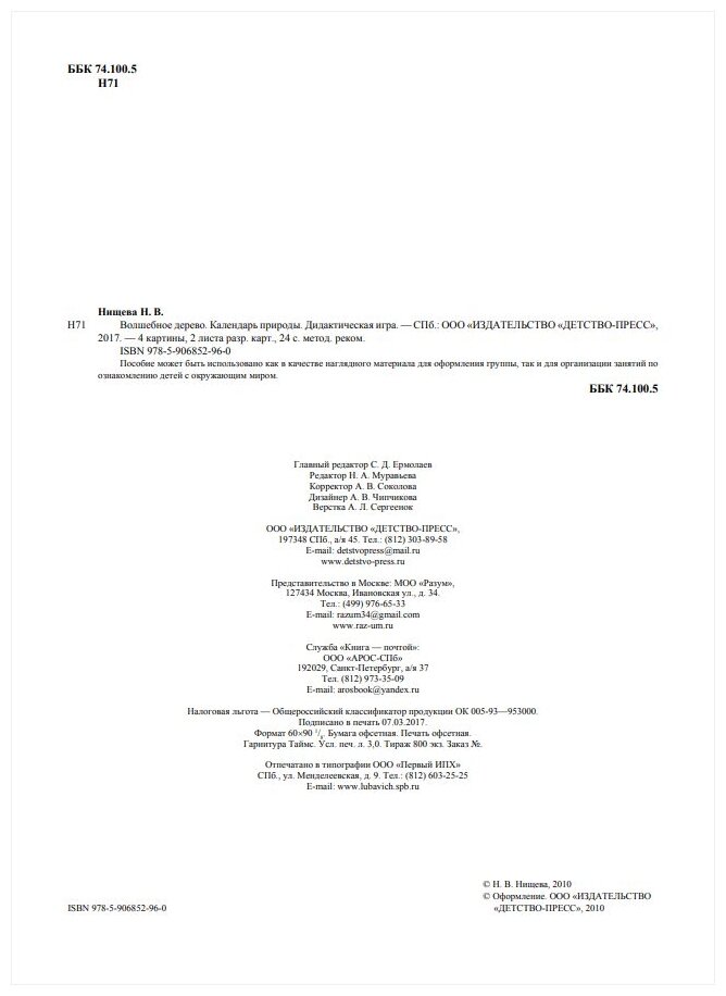 Волшебное дерево. Календарь природы. Дидактическая игра (3-7 лет) (Нищева Наталия Валентиновна); Детство-Пресс, 2018