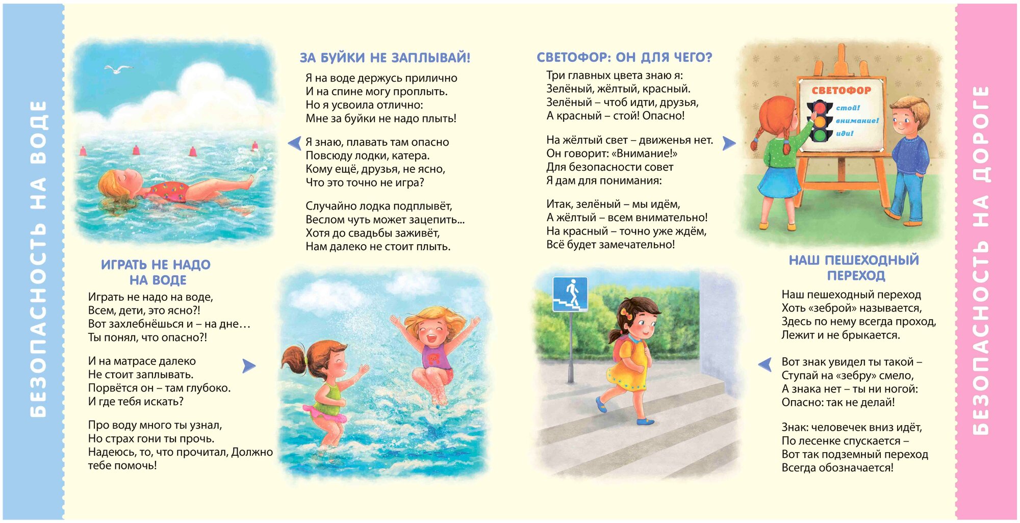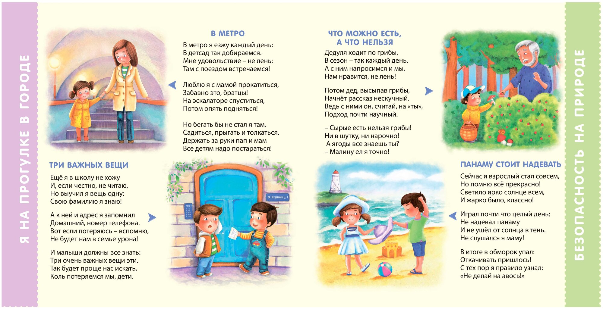 К покупке рекомендую, очень рада что приобрела эту книгу, с ней очень удобно рассказывать детям о столь важной теме, как безопасность. В книге восемь разворотов, на каждой странице по два стихотворения с картинками.