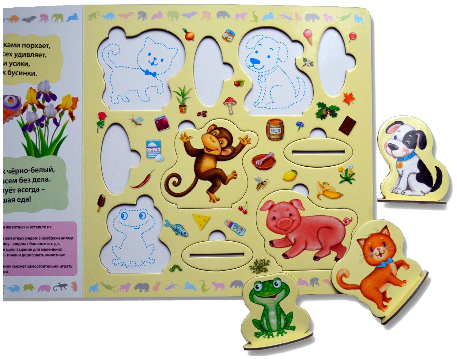 Загадки о животных. Многофункциональная книжка- в ней веселые загадки и пазлы. Можно читать, рассматривать картинки, также яркие и привлекающие внимания, можно поиграть, там картинки надо вставлять в нужные пазы и подумать над разгадкой. На два три года очень полезно будет, и даже старше. Тема книги- дикие и домашние животные. самые известные по сказкам и мультикам. Мой сынок трех лет ее полюбил, сидели с ней все выходные.