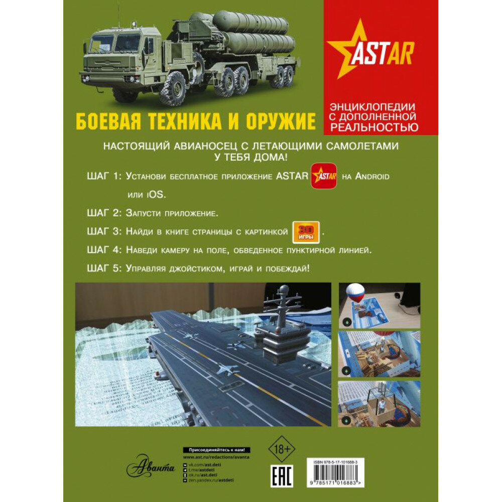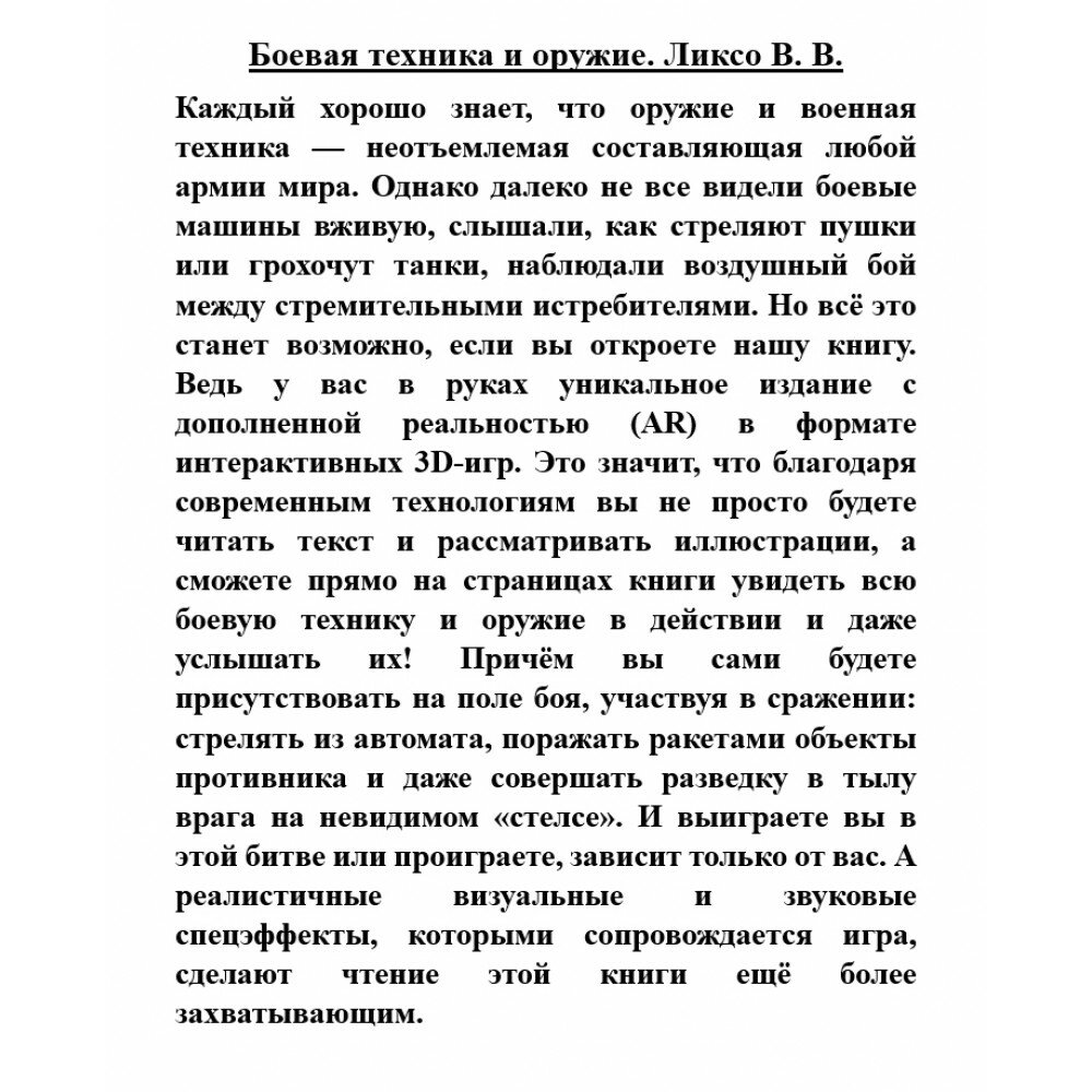 Каждый хорошо знает, что оружие и военная техника - неотъемлемая составляющая любой армии мира. Однако далеко не все видели боевые машины вживую, слышали, как стреляют пушки или грохочут танки, наблюдали воздушный бой между стремительными истребителями. Но всё это станет возможно, если вы откроете нашу книгу. Ведь у вас в руках уникальное издание с дополненной реальностью (AR) в формате интерактивных 3D-игр. Это значит, что благодаря современным технологиям вы не просто будете читать текст и рассматривать иллюстрации, а сможете прямо на страницах книги увидеть всю боевую технику и оружие в действии и даже услышать их! Причём вы сами будете присутствовать на поле боя, участвуя в сражении: стрелять из автомата, поражать ракетами объекты противника и даже совершать разведку в тылу врага на невидимом "стелсе". И выиграете вы в этой битве или проиграете, зависит только от вас. А реалистичные визуальные и звуковые спецэффекты, которыми сопровождается игра, сделают чтение этой книги ещё более захватывающим.