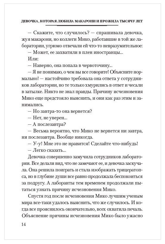 Перед вами руководство, что делать, если ты - обычная девочка с нездоровой страстью к пирожным, но тебе непременно нужно прожить тысячу лет. Шутка. На самом деле вы держите в руках целый сборник полных любви и волшебства историй - местами забавных, местами грустных. Кроме девочки, которая очень любила макарони, тут есть девочка, которая умела говорить с бетоном, странный инопланетянин Парапоропурун, Цикадая, которая явилась из Королевства Цикад, - и это еще не все удивительные персонажи, с которыми вы встретитесь в этой книге…