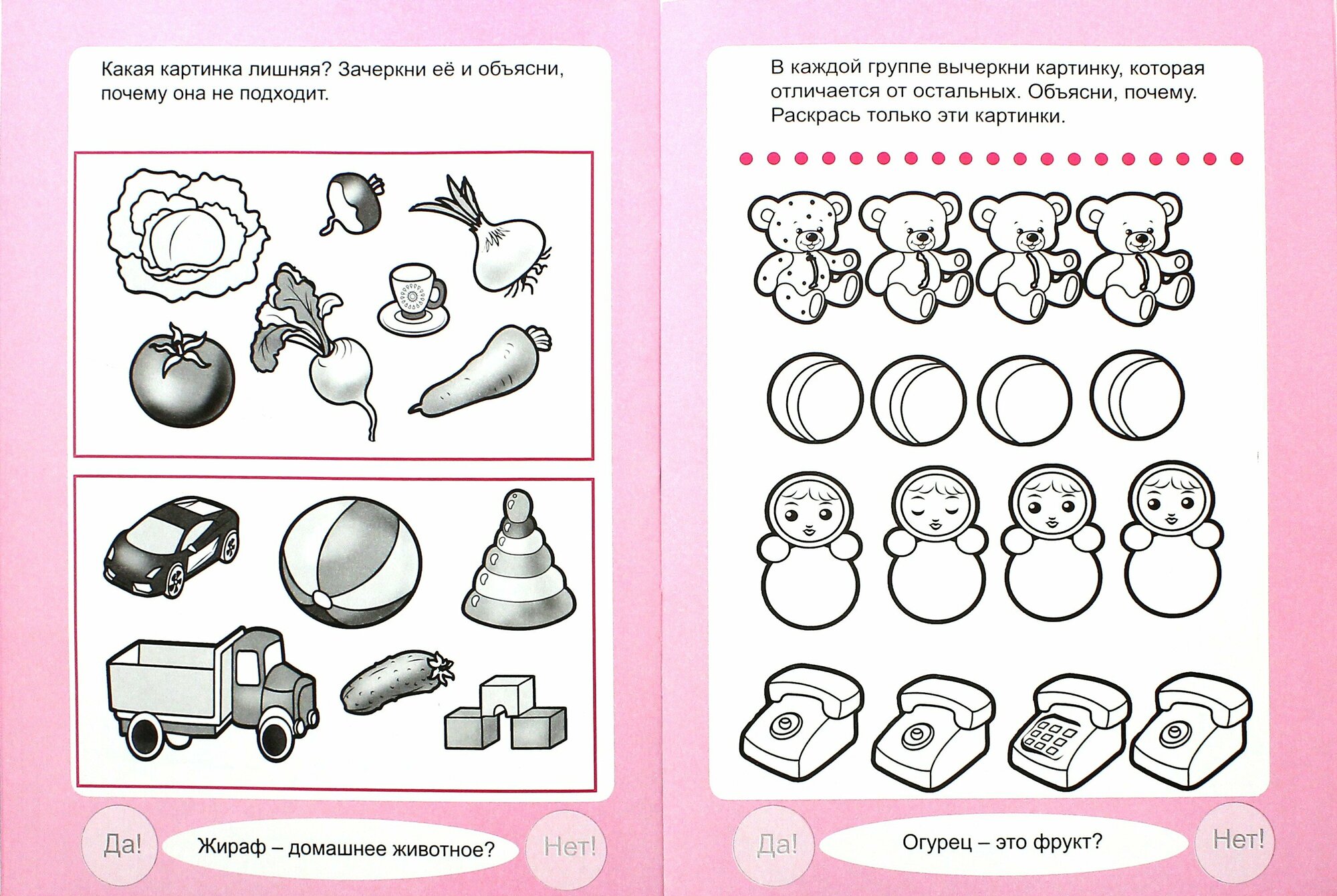 В каждой книге собраны задания, с учетом возраста для развития и закрепления определенных навыков ребенка. Вместе с заданиями в каждой книжке есть переменка-шутка (ребенку предлагается ответить на вопрос, часто шуточный, используя наклейки Да и Нет). Таким образом, в занятия вносится элемент игры и юмора.