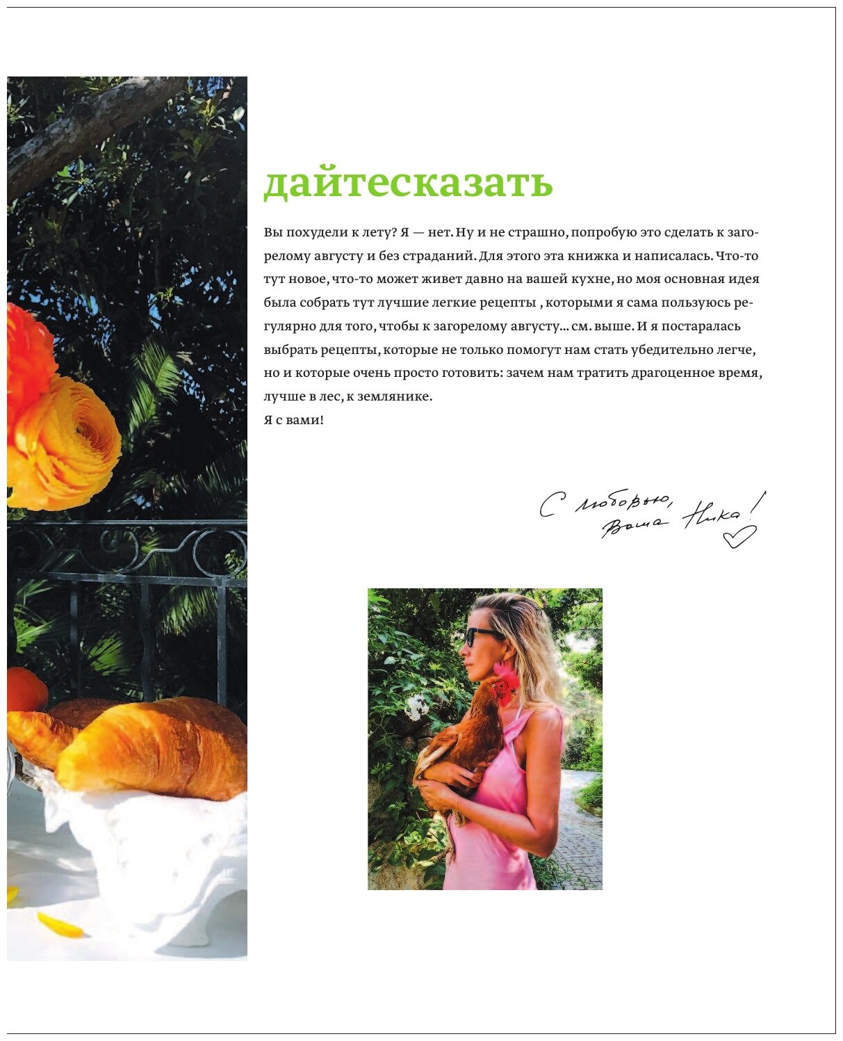 В эту книгу издателя, фотографа, известной кулинарной писательницы и популярного блогера Ники Белоцерковской вошли самые красивые и легкие рецепты, специально отобранные для лета. Кому не хочется отправиться в отпуск, похудев на несколько килограммов? Но сидеть на диете так скучно, а вокруг столько кулинарных искушений... С этими рецептами никакие соблазны вам не страшны. Молодые овощи, интересные закуски, яркие салаты, холодные и легкие супы, рыба, сезонные фруктовые десерты. Что еще нужно, чтобы мотивировать себя и не впадать в уныние, глядя на бледную отварную куриную грудь в сопровождении кучки полезного, но такого скучного овощного силоса в тарелке? С лучшими рецептами от Ники и знаменитых шефов вы сможете не только разнообразить свой ежедневный рацион, но и накрыть прекрасный стол для гостей.