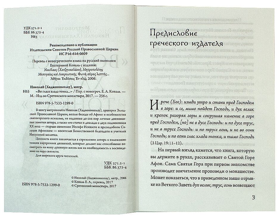 В книгу архиерея Элладской Православной Церкви, митрополита Николая (Хаджиниколау) "Во гласе хлада тонка..." вошли его беседы об Афоне и особенностях святогорского исихазма, не изданные до сих пор личные дневниковые заметки автора, цель которых - среди описания природных красот Афона запечатлеть тончайшими набросками и духовную атмосферу благодати, чтобы вдохновить читателя на ее поиски. В издании также представлены статьи и доклады владыки Николая о двух подвижниках XX века - старцах схимонахе Иосифе Исихасте и преподобном Силуане Афонском - носителях Божественной благодати и учителях Иисусовой молитвы.