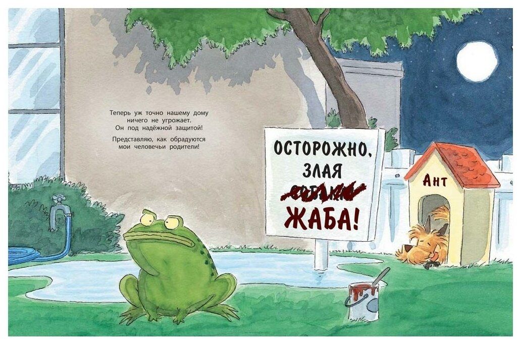 А что он интересного придумает - прочитаете в книге. Старший ребенок (4 года) очень хохочет над всем методами собачки. Хочу сказать, что в итоге собака придумывала-придумывала и в финале - дом остается под охраной и надежной защитой! Хотя и неожиданная концовка. Ведь дом теперь охраняет жаба)