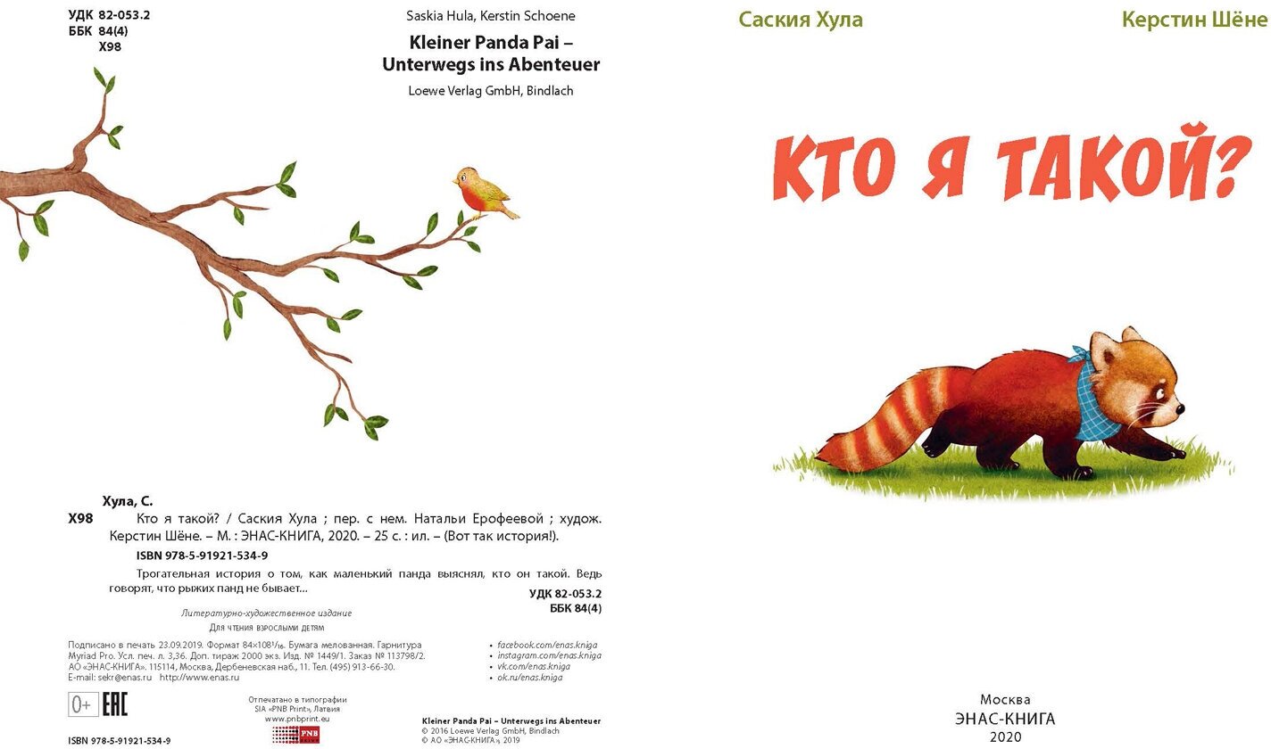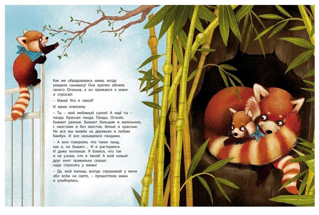Чудесная, весёлая и просто замечательная книга для малышей и деток по старше!!!! Я в восторге! Очень интересная история и том, как малыш красной панды бродя по зоопарку узнает кто он такой. Текст будет понятен деткам младшего возраста, но не будет скучен и взрослым! Мне так вообще показалось , что в нем присутствует тонкий , очень уместный и добрый юмор.