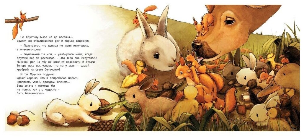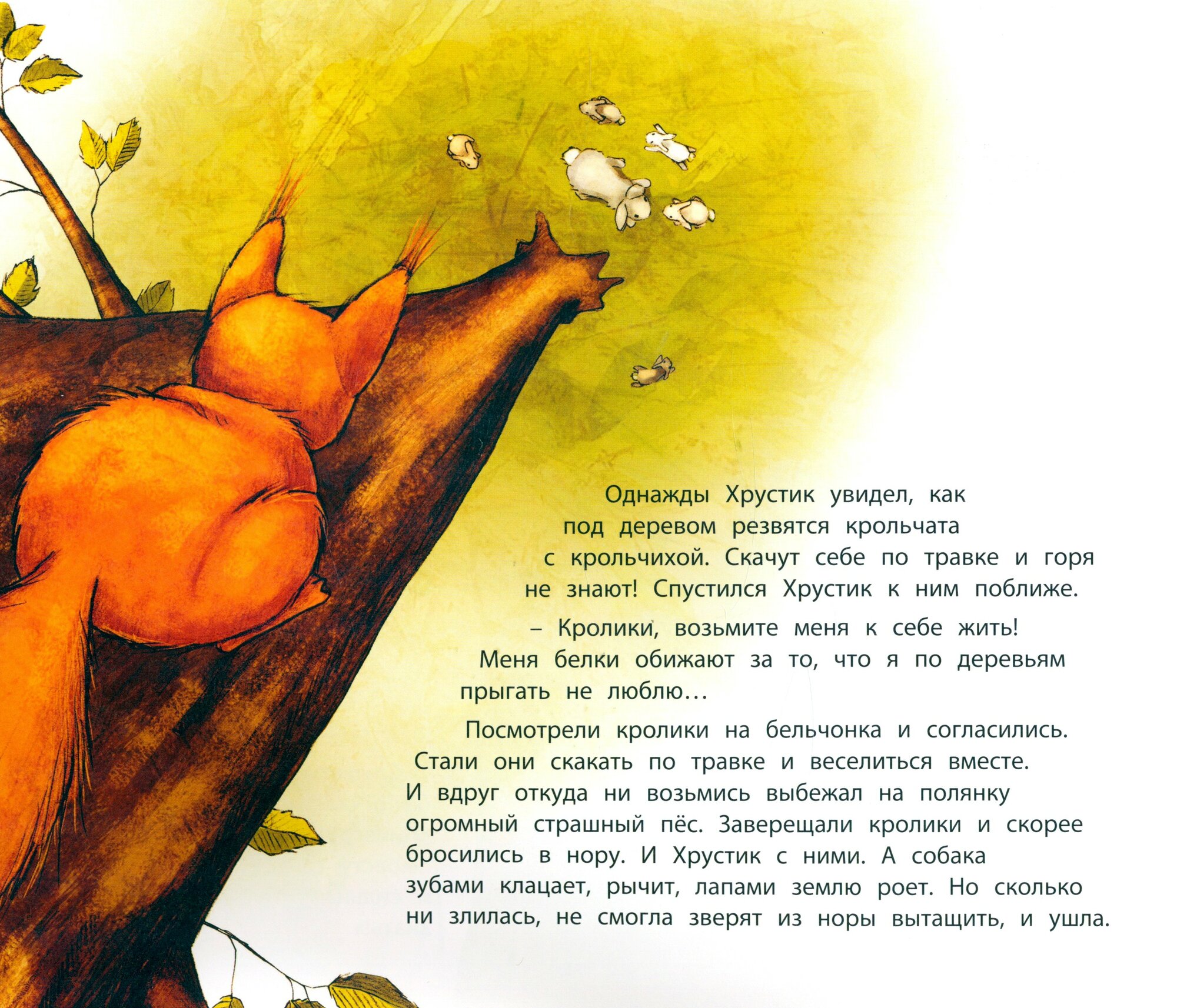 Маленький бельчонок Хрустик был таким робким, что братья и сёстры смеялись над ним и дразнили «маменькиным сынком». И вот однажды он собрался с духом и выбрался из гнезда. Он попробовал побыть кроликом, уткой, дроздом и даже оленем. Но, конечно, в конце концов бельчонок понял, что лучше всего быть самим собой. К тому же он сумел преодолеть свою робость и стал самым храбрым бельчонком на свете!