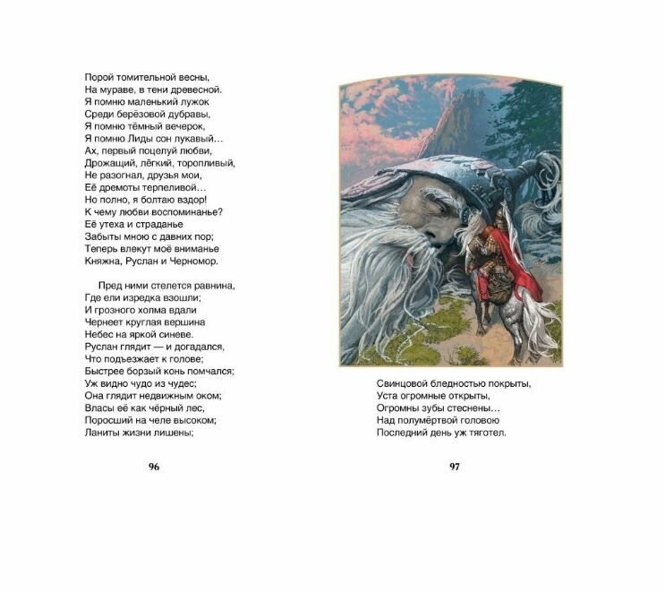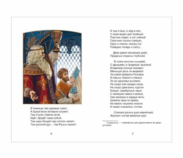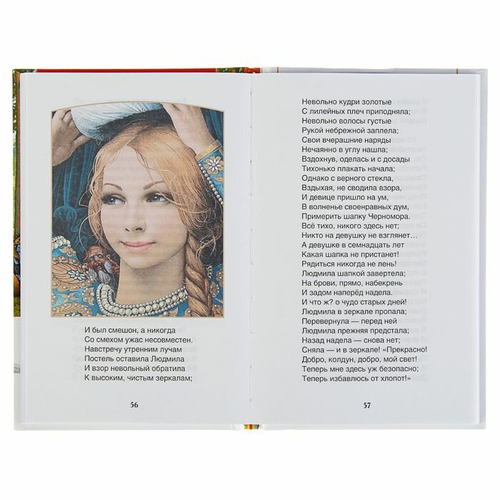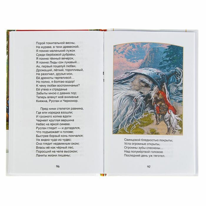 Ребенку в школе подарили эту книгу "Руслан и Людмила" Александра Сергеевича Пушкина, он домой вернулся очень довольный, потому что дома есть эта поэма только в сокращённом варианте. Сама книга небольшого формата, но очень хорошо оформлена. Твердый яркий красивый переплет, качественная белая бумага, средний комфортный для глаз шрифт, практически через страницу на весь лист очень красивая иллюстрация, которой можно долго любоваться, соответствующая тексту. Для нас очень важно - что поэма напечатана в полном варианте, без сокращения. С удовольствием сын сам прочел книгу. Для школьной программы она необходима!