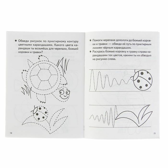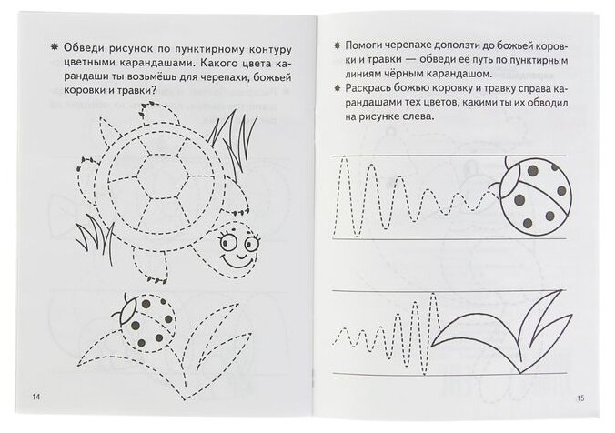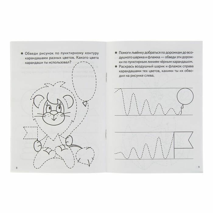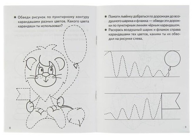 Рисунки на первой странице и далее на всех четных (расположенных слева) страницах рекомендуем обводить цветными карандашами. Задания на нечетных (правых) страницах, где ребенку предстоит «добраться до цели», желательно выполнять черным остро подточенным карандашом, чтобы линия, которую будет вести ребенок, была яркой и малыш видел свою работу. Следите за тем, чтобы ребенок старался вести линию, не отрывая руки. Важно увлечь ребенка работой: обсудите то, что изображено на картинке; когда задание будет выполнено, предложите ее раскрасить.