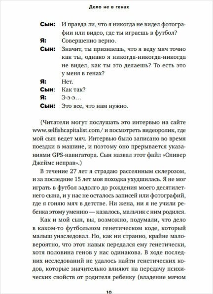 Книга полезная, интересная, но немного затянута: автор мусолит одну единственную мысль, что всё наше поведение, все наши характеры и "генетические предрасположенности" на самом деле не генетические, а результат нашего воспитания, копирование поведения наших родителей, а также результаты вдалбливания в нас нашими родителями того, что они хотели нам вдолбить
