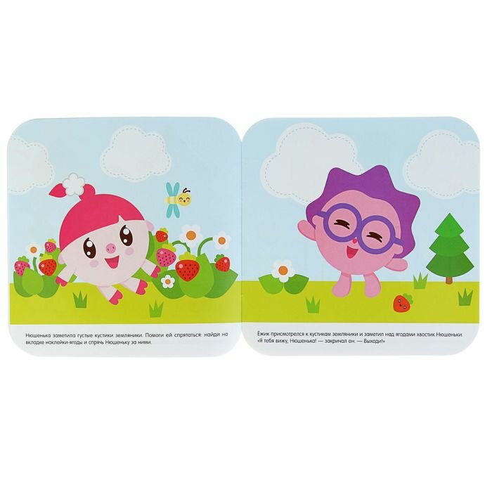 Покупали книгу дочке друзей. Видимся с ними более-менее часто, но в силу возраста (2,5) она еще нас не очень запоминает и поэтому относится очень настороженно. А эта книга помогла наладить контакт. Уже с первой страницы удалось завладеть вниманием малышки, которая смотрит мультики про малышариков и любит их больше чем более взрослых смешариков, и она не успокоилась, пока не помогла всем малышарикам «спрятаться» за наклейками: шишками, цветочками, грибочками, ягодками, которые она с удовольствием расклеивала по страницам. Так что книги серии рекомендую и родителям и приходящим гостям, ребенок будет заниматься с интересом.