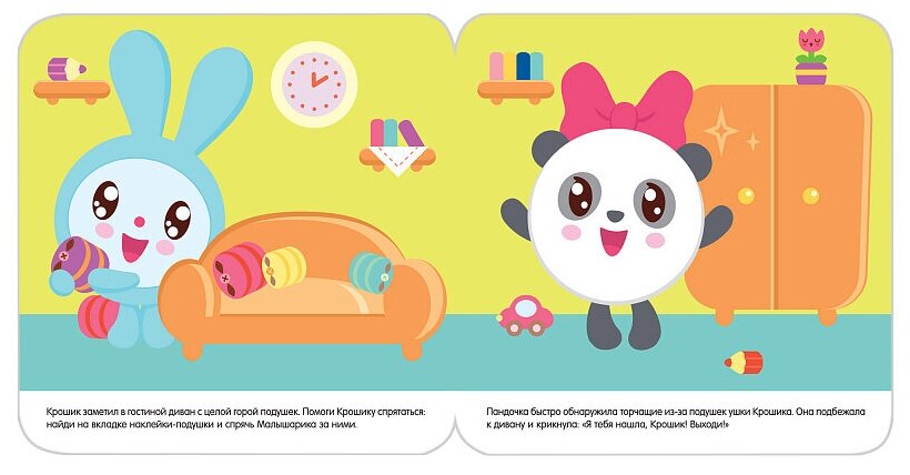 А Вы любите играть в прятки? С этой яркой книжкой ребенок побывает в доме, познакомится с очаровательными Малышариками и поиграет с ними в прятки. Малыш с удовольствием поможет спрятаться Барашку, Нюшеньке, Пандочке, Ежику и другим героям, заклеив их красочными наклейками.