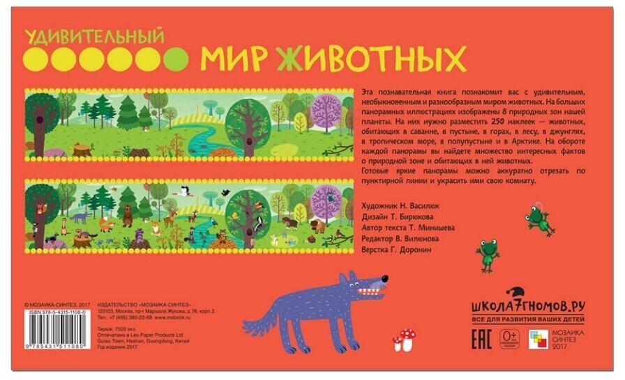 Внутри маленький читатель найдет 250 многоразовых наклеек с изображениями животных, которыми необходимо дополнить 8 больших панорамных иллюстраций с пейзажами 8 природных зон: саванны, пустыни, гор, леса, джунглей, тропического моря, полупустыни и Арктики. Это занятие принесет ему не только радость, но и пользу – на обороте каждой панорамы его ждет множество занимательных фактов.
