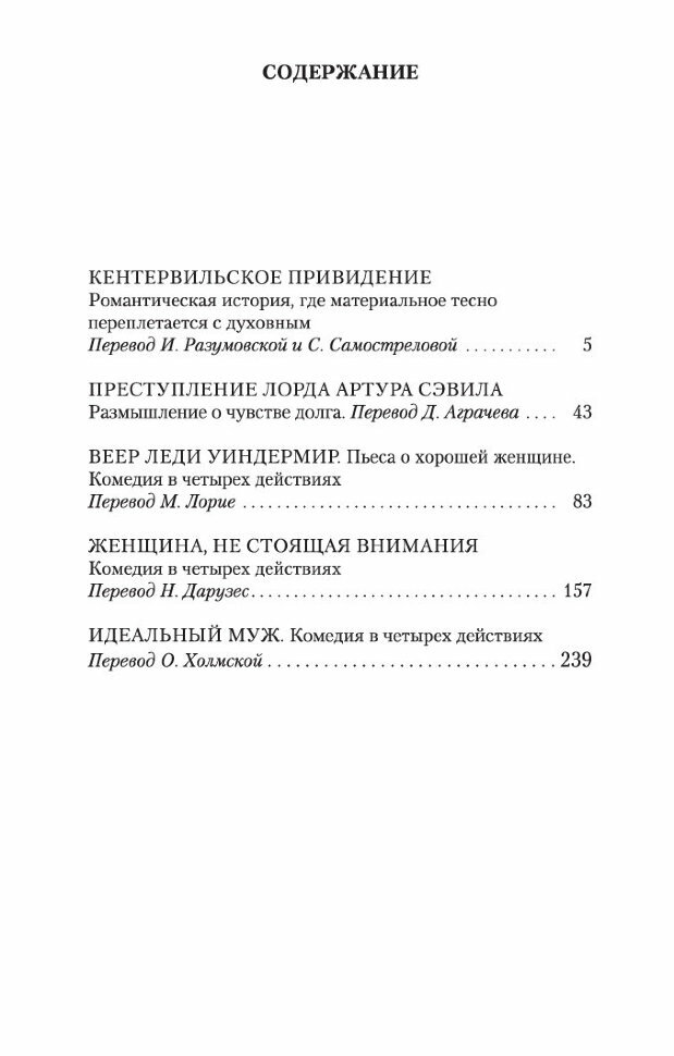 Оскар Уайльд – блистательный английский писатель, поэт, драматург и художественный критик, мэтр европейского эстетизма, автор скандально знаменитого романа «Портрет Дориана Грея». В настоящий сборник включены изящные, остроумные повести и комедии, создавшие Уайльду славу одного из увлекательнейших и смелых английских прозаиков конца XIX века: пародийно-готическая повесть «Кентервильское привидение», комедийный детектив «Преступление лорда Артура Сэвила», а также три пьесы: «Веер леди Уиндермир», «Женщина, не стоящая внимания» и «Идеальный муж».