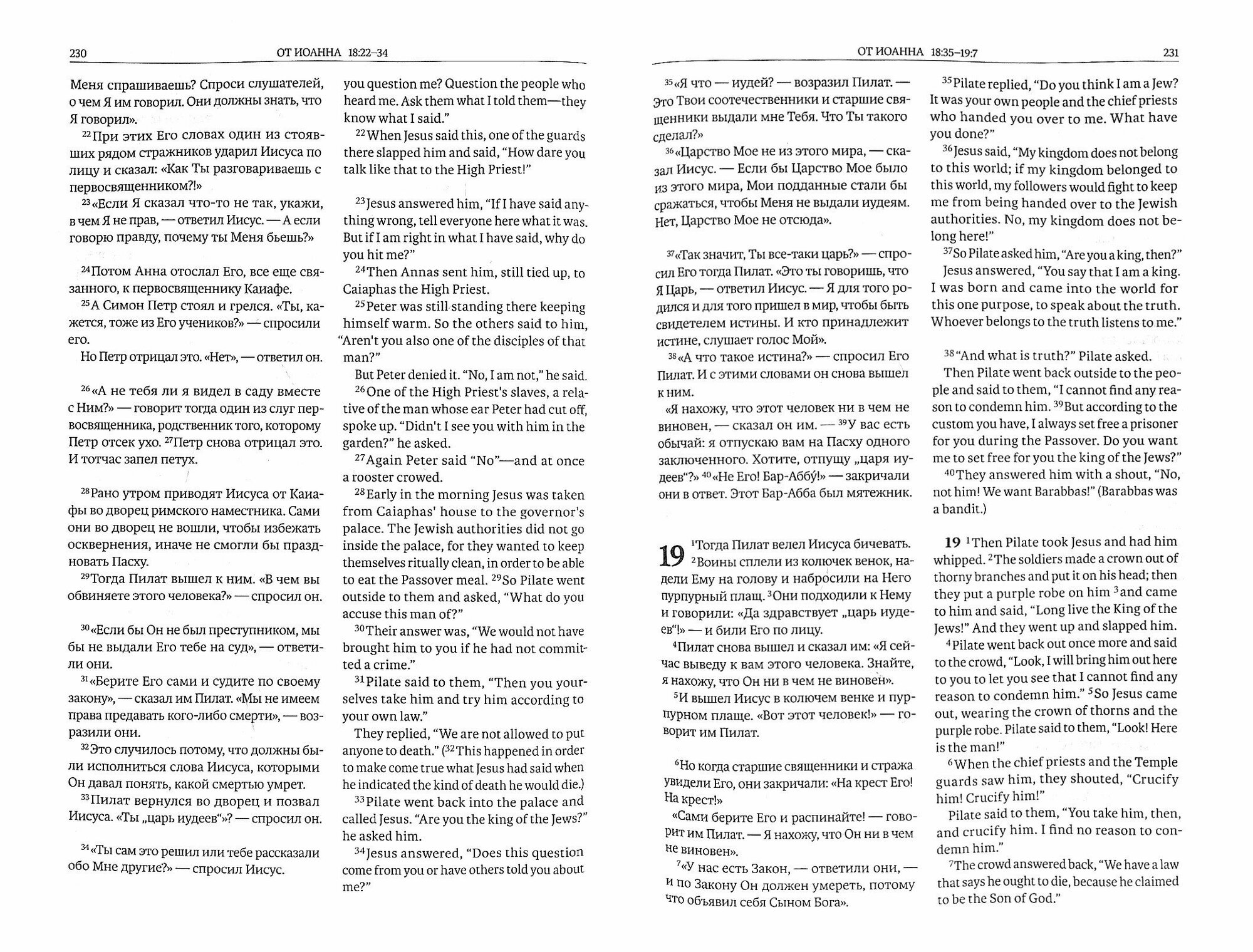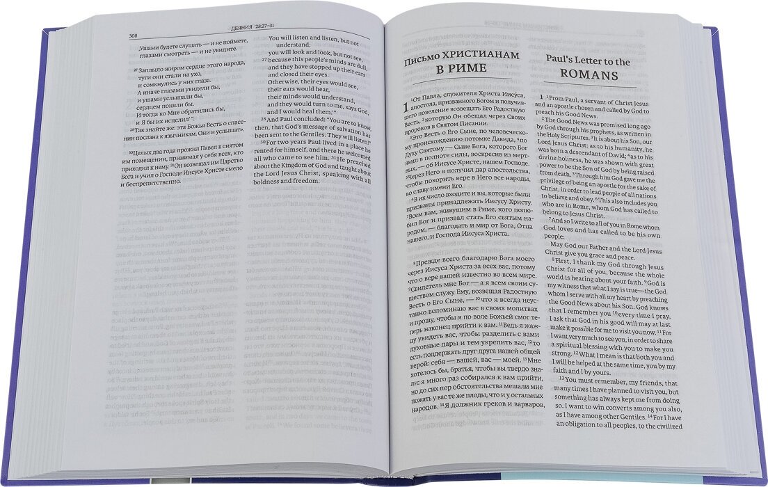 Прекрасное издание Нового Завета на русском и английском языках. Параллельный перевод позволяет узнать христианско-теологическую терминологию на английском языке (например, prophet - пророк, salvation - спасение, Holy Spirit - Святой Дух и др.).