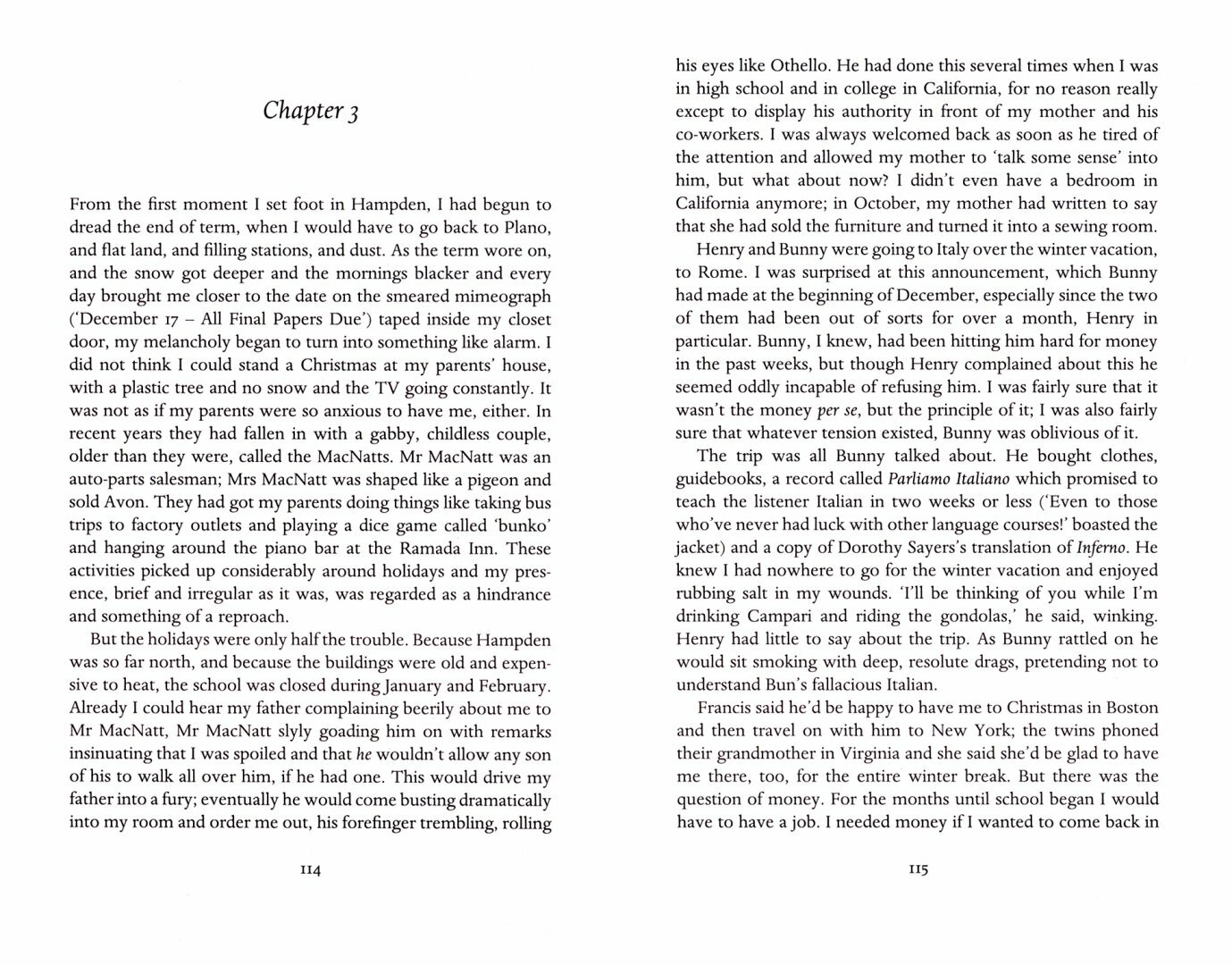 Об этой книге я был наслышан. И вот решил все же прочитать. Что же, не плохо, очень даже. Мне понравилось, но могло быть и лучше. Ричард, он же главный герой, поступил в довольно престижное учебное заведение - все благодаря его природным талантам и усидчивости. Так как на родителей рассчитывать не приходилось, да и не сильно они переживали за будущее сына, но привык во всем и всегда полагаться только на себя. И вот во времена студенчества Ричард узнает о круге студентов, которые занимаются изучением античной культуры и словесности, руководимые одним из преподавателей. И вот главный герой становится частью этого "античного" кружка. Но вместе с принадлежностью к этой группе, Ричард становится соучастником убийства, и тогда начинаются все его сложности. То, что он с такой тщательностью добивался, может исчезнуть в один миг. Сам роман я бы разделила на две части - само убийство, и то, что было потом. Это словно детектив, только наоборот - известно кто убил, а потом уже идет и само расследование.