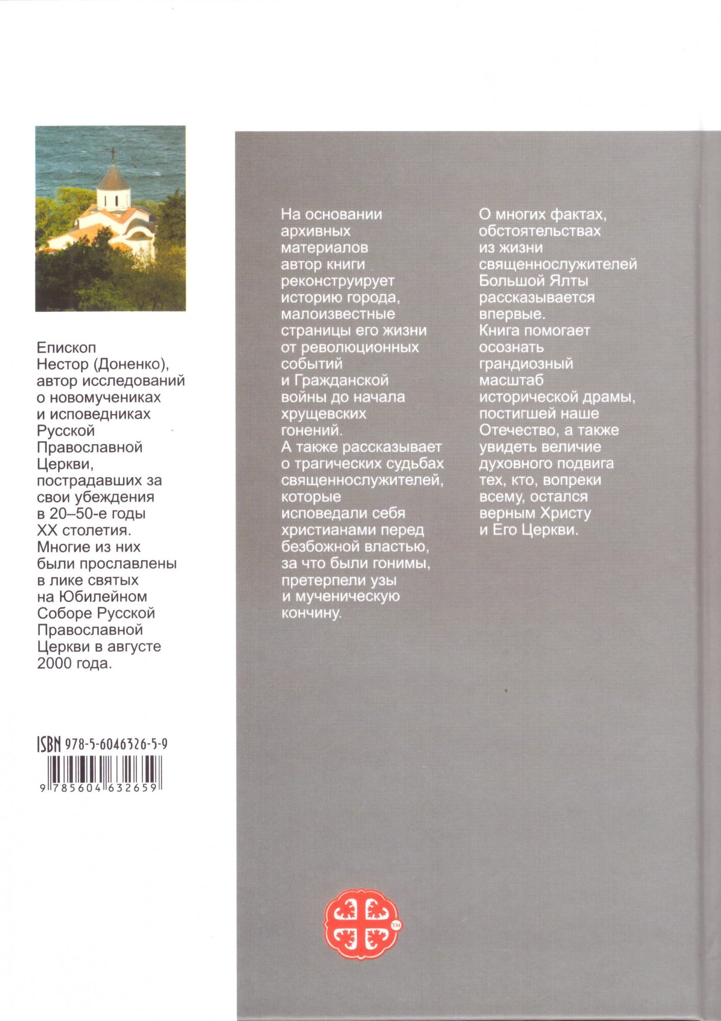 На основании архивных материалов автор книги реконструирует историю города, малоизвестные страницы его жизни, начиная с революционных событий и Гражданской войны до начала хрущевских гонений. Особое внимание сосредоточено на трагических судьбах православных священнослужителей, большинство из которых исповедали себя христианами перед безбожной властью, за что были гонимы, претерпели узы и мученическую кончину. О многих фактах, обстоятельствах из жизни священнослужителей Большой Ялты рассказывается впервые. Книга помогает осознать грандиозный масштаб исторической драмы, постигшей наше Отечество, а также увидеть величие духовного подвига тех, кто вопреки всему остался верным Христу и Его Церкви.