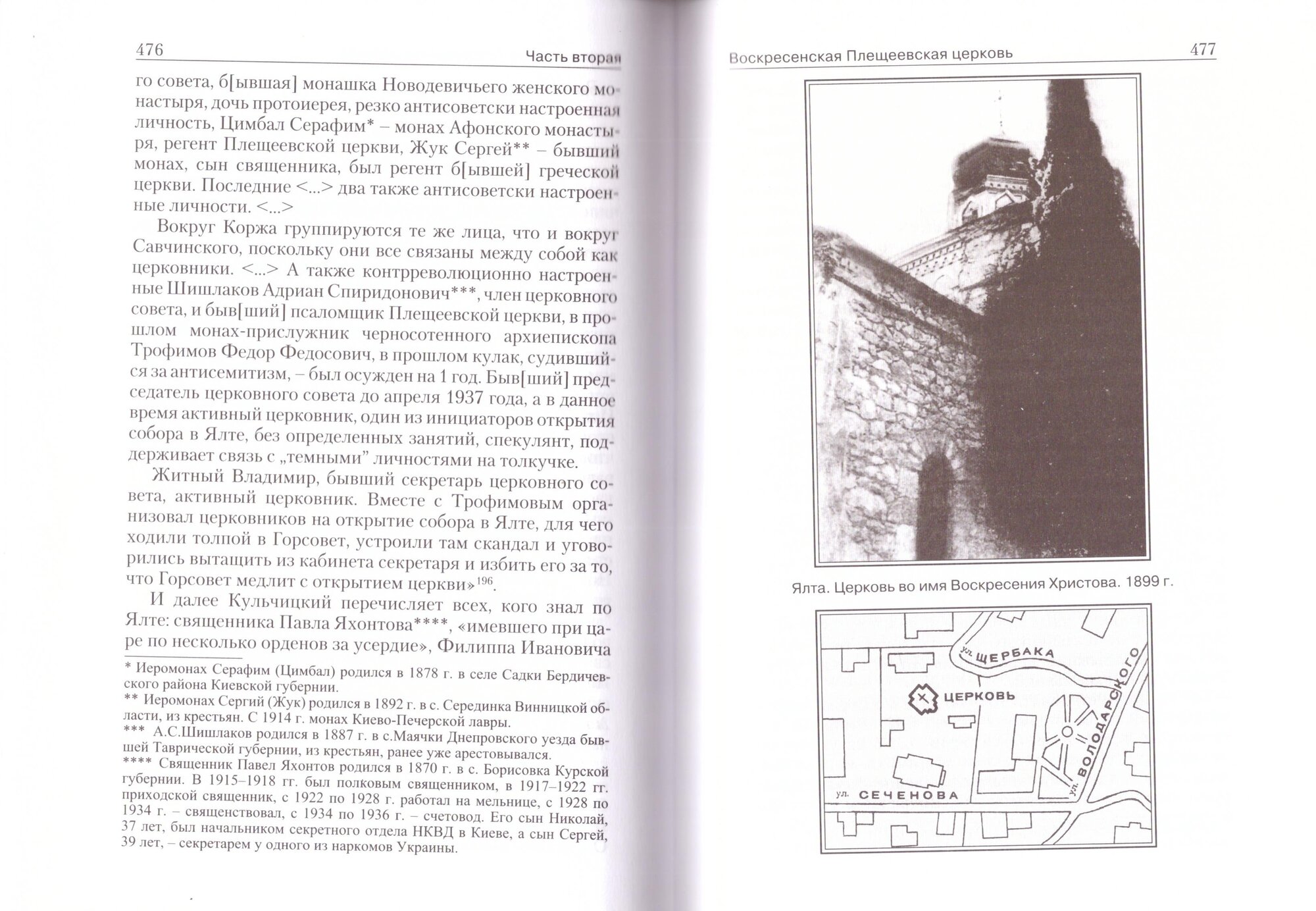 Первая глава книги обстоятельно (около 170 стр.) рассказывает об истории Ялты в годы революции и Гражданской войны. Вторая и основная часть посвящена тем репрессиям, которые обрушила новая власть на церкви и монастыри, верующих и священнослужителей. Как это уже стало традиционно для книг о. Николая, его повествование выстроено в виде очерков о людях, жизнь которых оказалась размолота жерновами преследований, организованных и проведенных крымскими чекистами, преимущественно в 1920-30-е гг., хотя в конце книги говорится и судьбе священников, осужденных после Великой Отечественной войны. 1950-е гг. затронуты лишь постольку, поскольку на них пришлось продолжение судеб ряда героев книги. Последовательного описания истории взаимоотношений РПЦ и советской власти в данном издании нет, хотя неустанная работа над своими книгами о. Николаем внушает надежду на то, что эта тема будем развита в последующих изданиях (рассматриваемое является вторым).