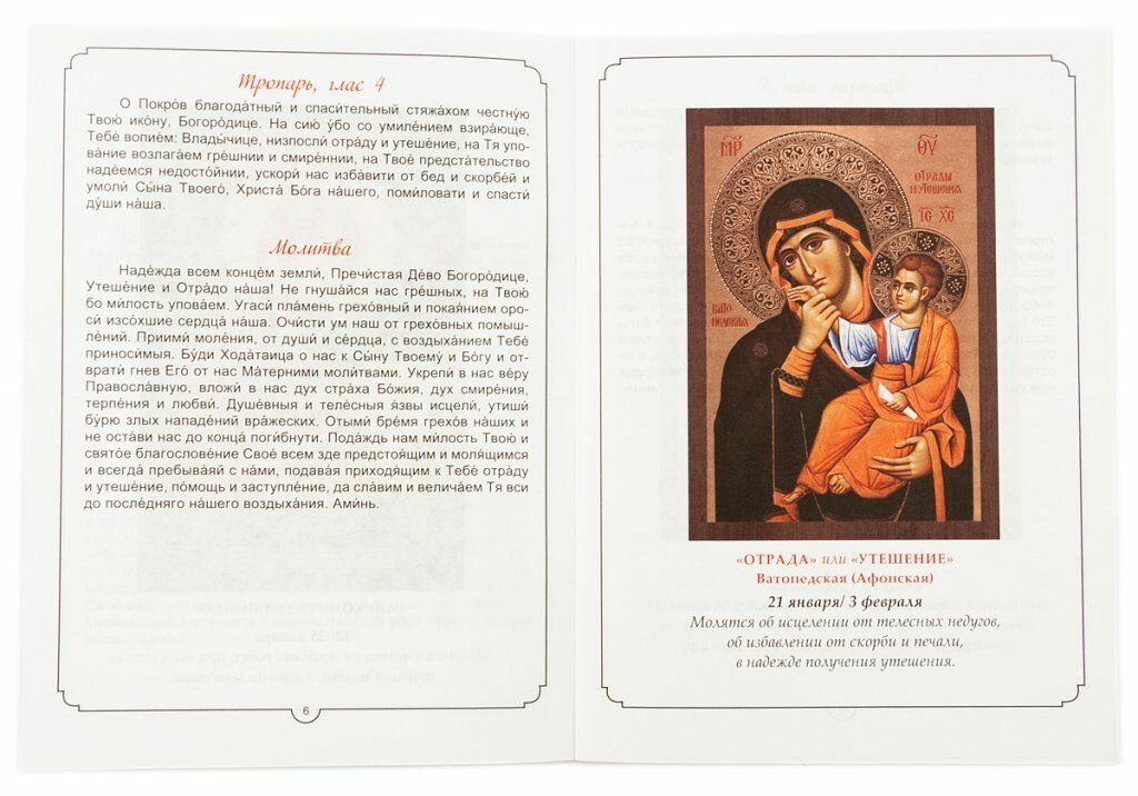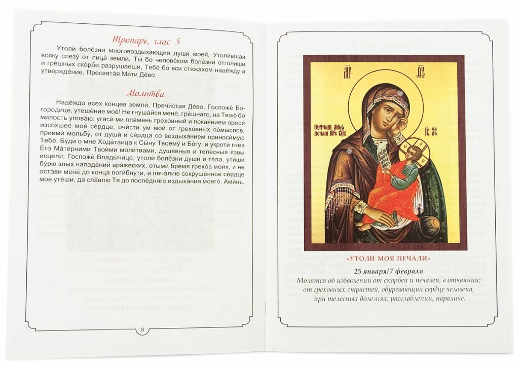 Образов Божией Матери во всем мире насчитывается довольно много. Однако некоторые из них особо отличились своей чудесной помощью. Такие иконы еще принято называть чудотворными. Почти в каждом православном доме вы найдете, например, образ Казанской иконы Богородицы. В народе большой любовью также пользуются иконы Федоровская, Владимирская, Иверская, Неупиваемая Чаша и некоторые другие. В молитвослове, который сейчас перед вами, составители поместили обращения к 45 таким иконам Божией Матери. Каждому образу отведет один разворот, на котором вы увидите цветную икону, краткие сведения о том, когда совершается Церковью празднование данной иконы, с какими бедами и проблемами принято обращаться с молитвенным обращением к тому или иному образу. К каждой иконе дана молитва и тропарь.