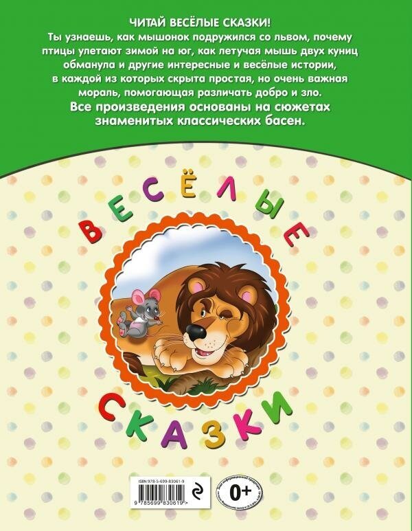 Читай весёлые сказки! Ты узнаешь, как мышонок подружился со львом, почему птицы улетают зимой на юг, как летучая мышь двух куниц обманула и другие интересные и весёлые истории, в каждой из которых скрыта простая, но очень важная мораль, помогающая различать добро и зло. Все произведения основаны на сюжетах знаменитых классических басен.