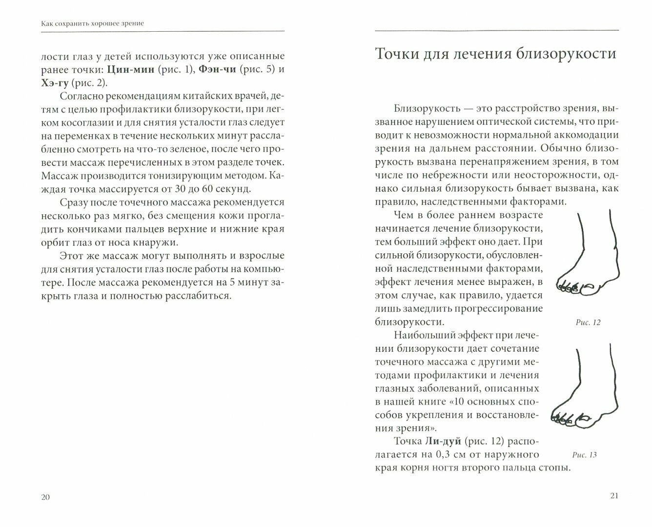 маленькая брошюрка , плохо что нет схемы такой единицы измерения как цунь . Понравилось , что указали противопоказания . Важный момент насчёт лечения близорукости : Чем в раннем возрасте начать исправление, тем лучше . Также кроме точек нужно смотреть на огонь(свечу) каждый день . От себя добавлю, чтобы избежать ухудшения зрения - нельзя пИсать на костёр, так как это оскорбление стихии Огня, а в организме она отвечает за зрение