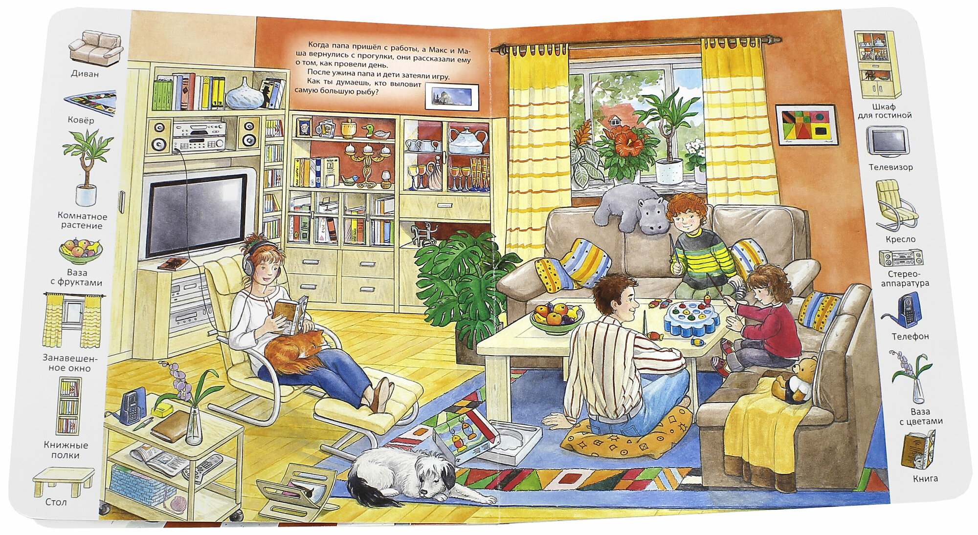 Нам год и семь. Рассматриваем с интересом, особенно долго рассматривал кладовку с её многочисленными баночками! На каждой страничке искал кису и собачку, а в ванной комнате рыбок.. особенно понравилась люстра в форме рыбы!