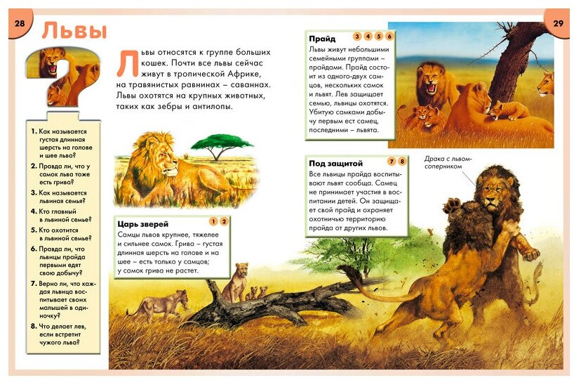 Эта иллюстрированная энциклопедия в форме вопросов и ответов посвящена всему самому интересному, что есть на свете. Ты узнаешь много нового о тиграх и львах, дельфинах и китах, автомобилях и кораблях, горах и саваннах, а также о гигантских динозаврах. Одни вопросы покажутся тебе легкими, другие заставят крепко призадуматься. Найди ответы на страницах книги и проверь себя, заглянув в последний раздел.