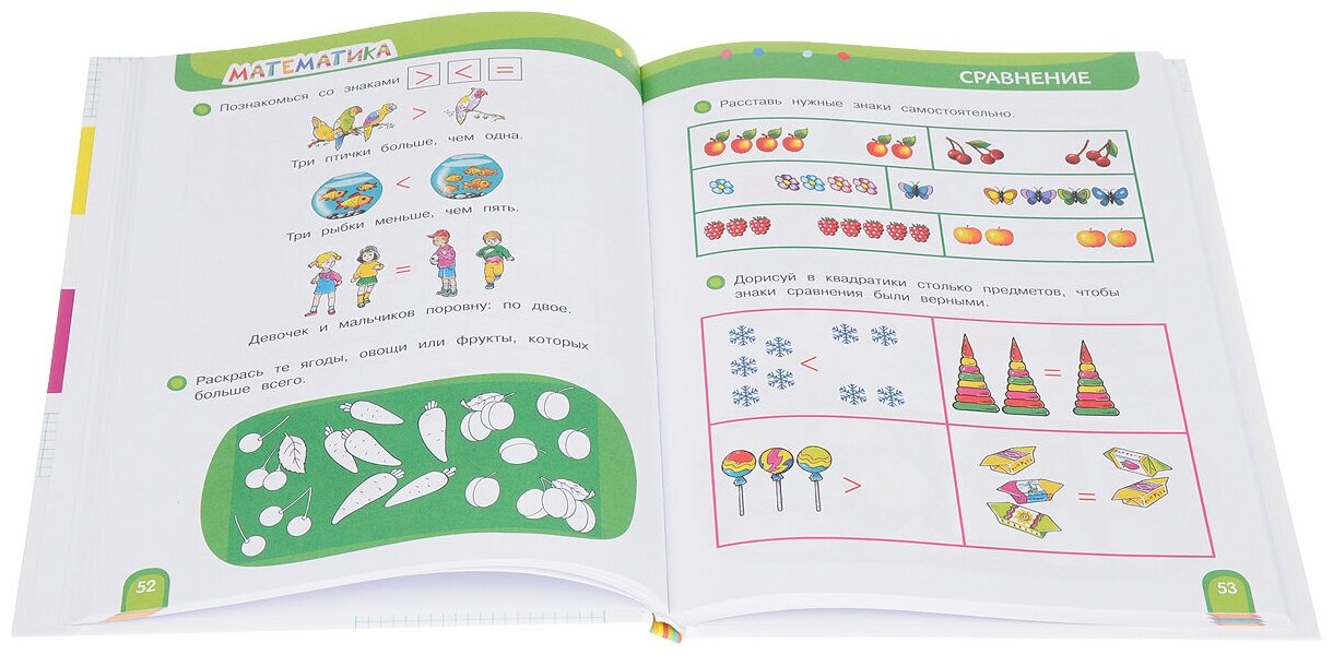 От книги просто в восторге! За небольшую цену 150 страниц довольно качественной бумаги и красочной полиграфии. Я бы назвала её книга-рабочая тетрадь (только в твердом переплете) - можно и раскрасить что-то , и обвести. Очень разносторонняя: и изучение алфавита, и счет до десяти, и геометрия, и раскраски, и упражнения на логику и мышление, и развитие памяти. Есть мини энциклопедия и сказки.