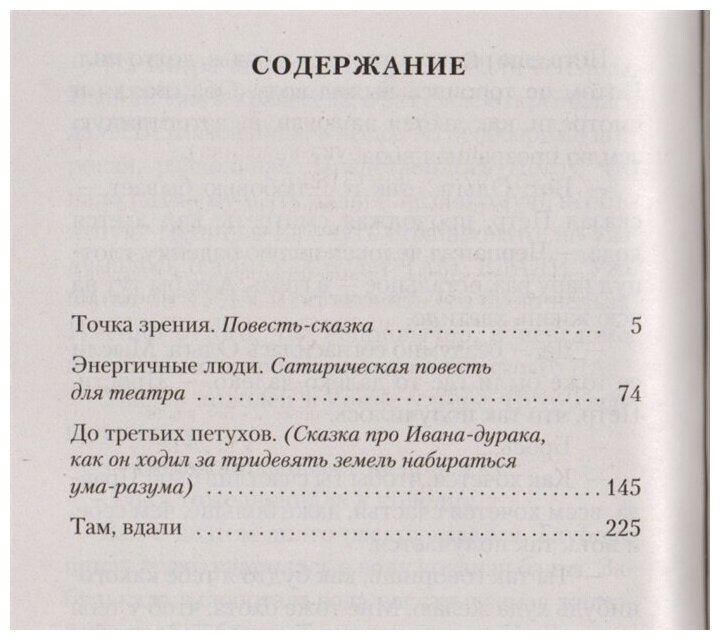 В настоящую книгу вошли сатирическая повесть для театра «Энергичные люди», повести-сказки «Точка зрения» и «До третьих петухов», а также повесть «Там, вдали».