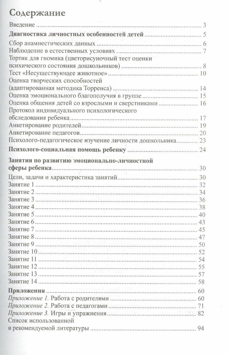 В книге есть диагностика личностных особенностей детей:"Тортик для гномика","Несуществующее животное", оценка творческих способностей, оценка эмоционального благополучия в группе, оценка общения детей, наблюдение в естественных условиях, анкетирование. Прилагаются 14 занятий по развитию эмоционально-личностной сферы. Возраст детей 5-6 лет. В ходе занятий применяются игровые наборы "Дусима", песочная терапия. Подборка игр и упражнений различной тематики. Работа с педагогами: 4 формы работы. Работа с родителями: 4 формы работы. Удобный формат книги.