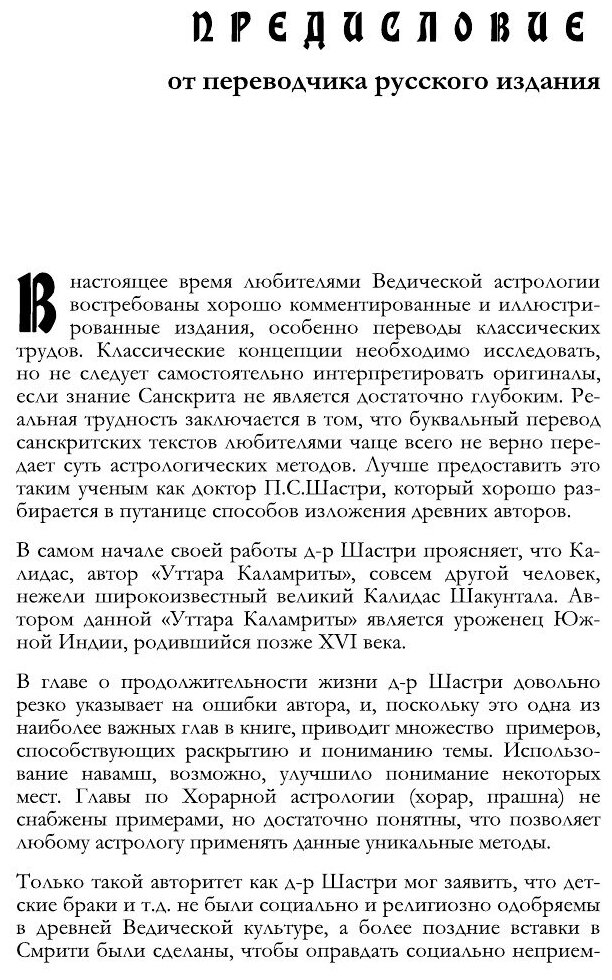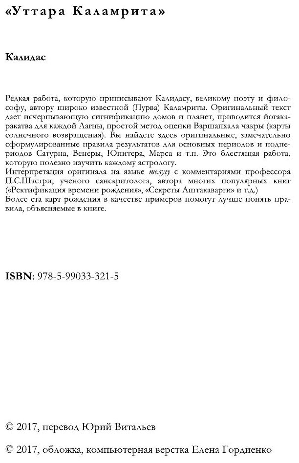 «Уттара Каламрита» - древний трактат и важная веха развития Индийской астрологии. Впервые была опубликована в подлиннике на языке телугу. Сам манускрипт в настоящее время доступен в рядке библиотек Индии, в том числе в Библиотеке восточных рукописей Правительства Индии. Это редкая работа, которую приписывают Калидасу, великому поэту и философу, автору широко известной (Пурва) Каламриты.